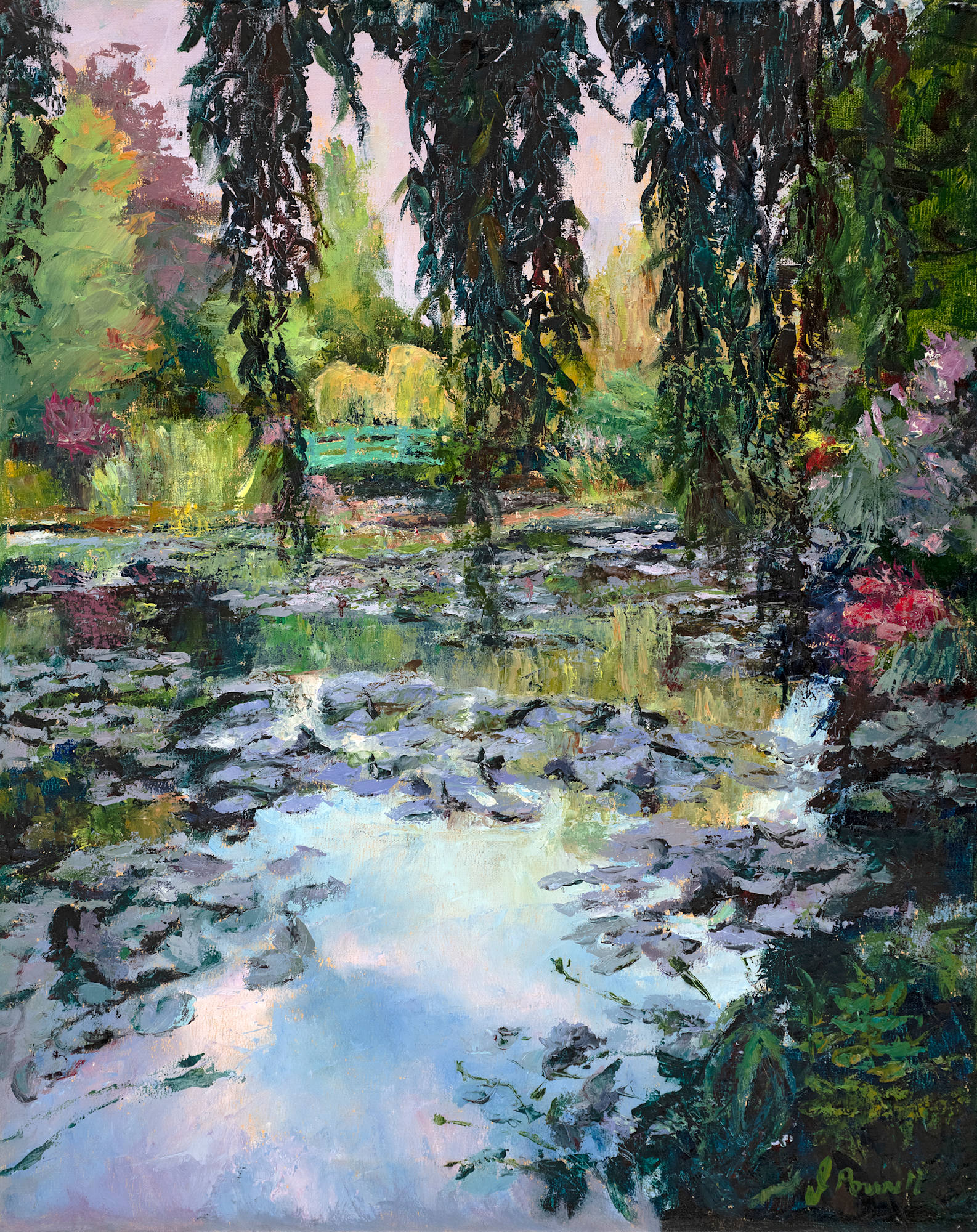 MessageWho cannot love Monet's water lilies? This is the first I have tried to paint them but greatly enjoyed doing it while thinking about my 2012 visit to Giverny. I loved the wooded environment of the lily pond.