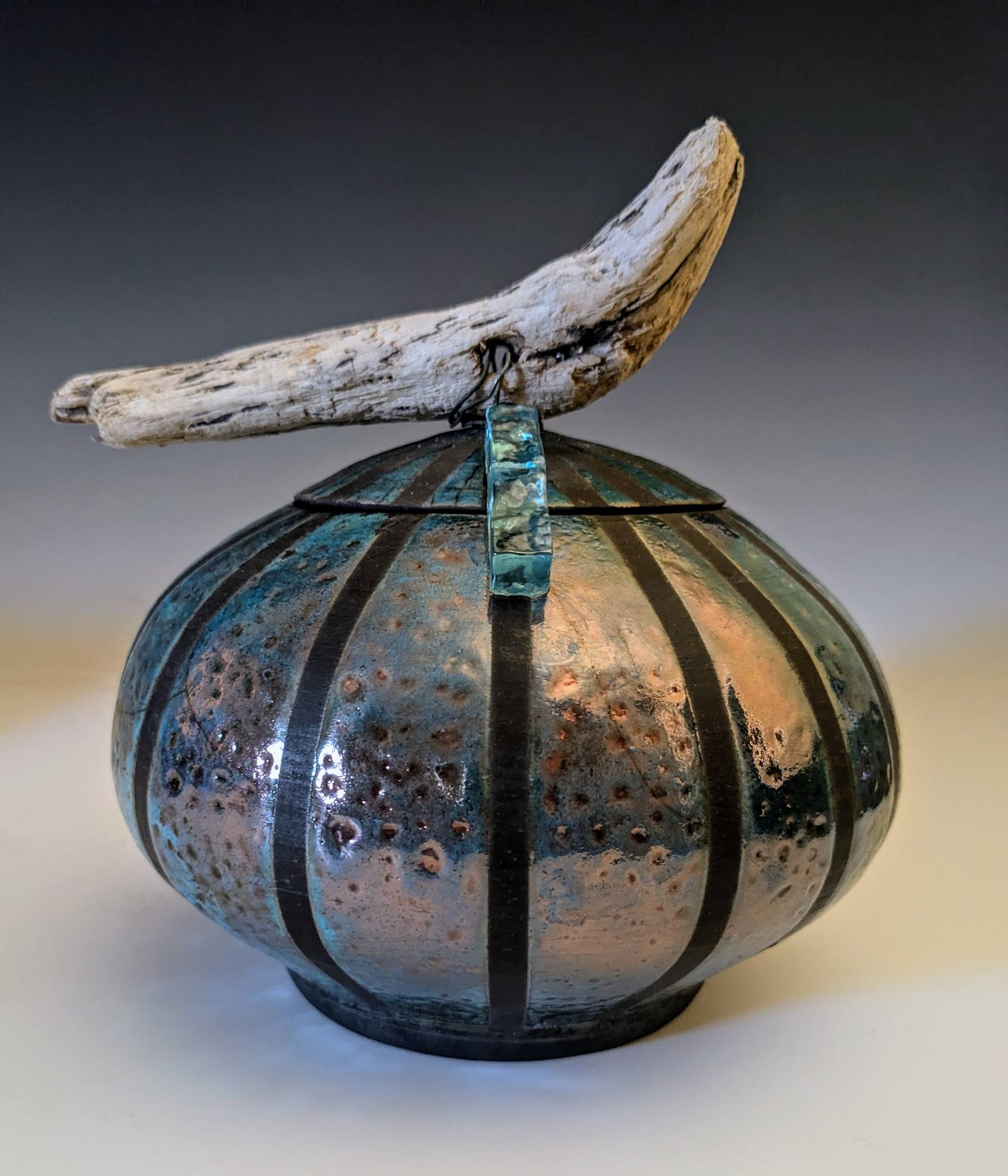 MessageThis jar was raku fired, where the piece was removed from a kiln when red hot and plunged into combustible materials giving the piece it's characteristic blackened areas and metallic shine. The lid is embellished with a driftwood handle and a glass tile.