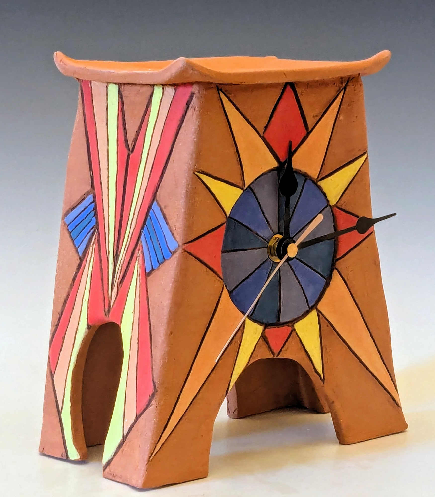 This mantel clock was handbuilt with Earthenware clay and decorated with velvet underglazes to create a bright and cheerful time piece.