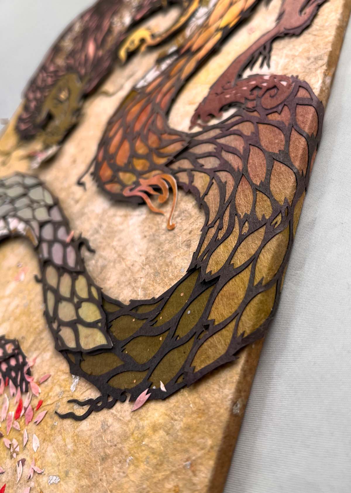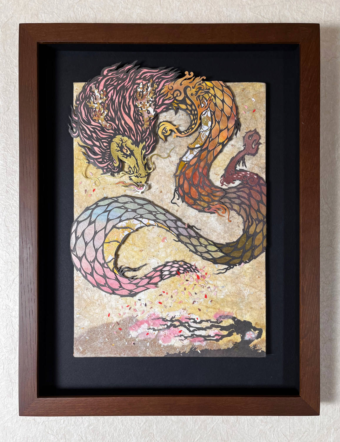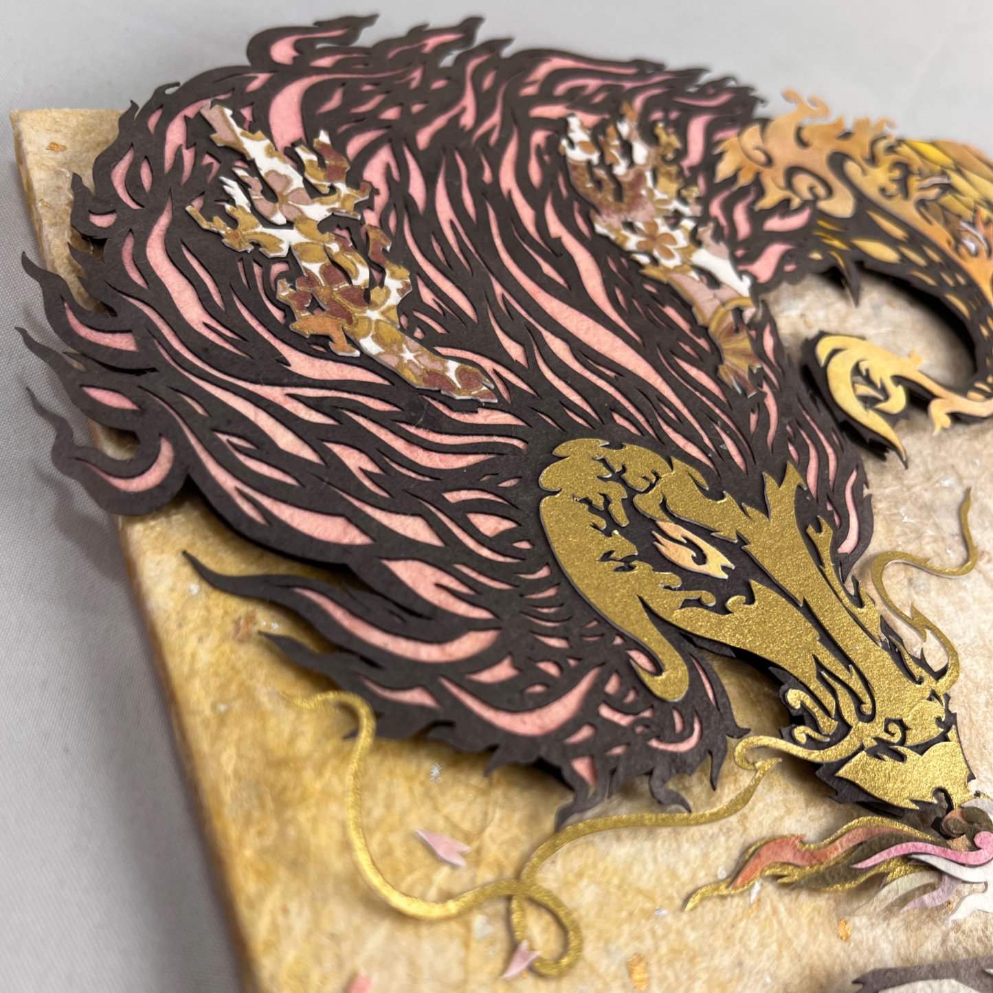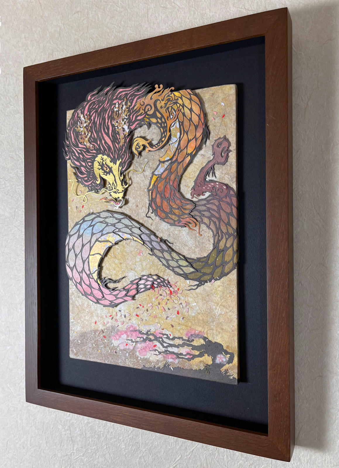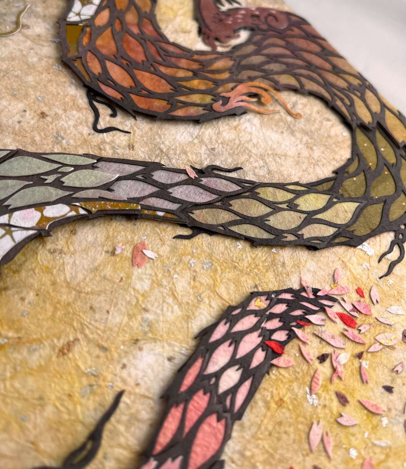 Small moments and humble beginnings reveal profound greatness as cherry blossoms swept aloft by the wind coalesce in a transformative whirl. Intricately cut and deeply layered by hand "Carried on a Breeze" is a striking and elegant revelation of the subtle power of nature and the potential to grow beyond our supposed limits. Created from vibrant washi and chiyogami papers.