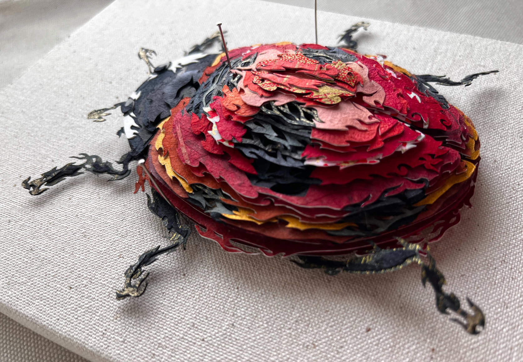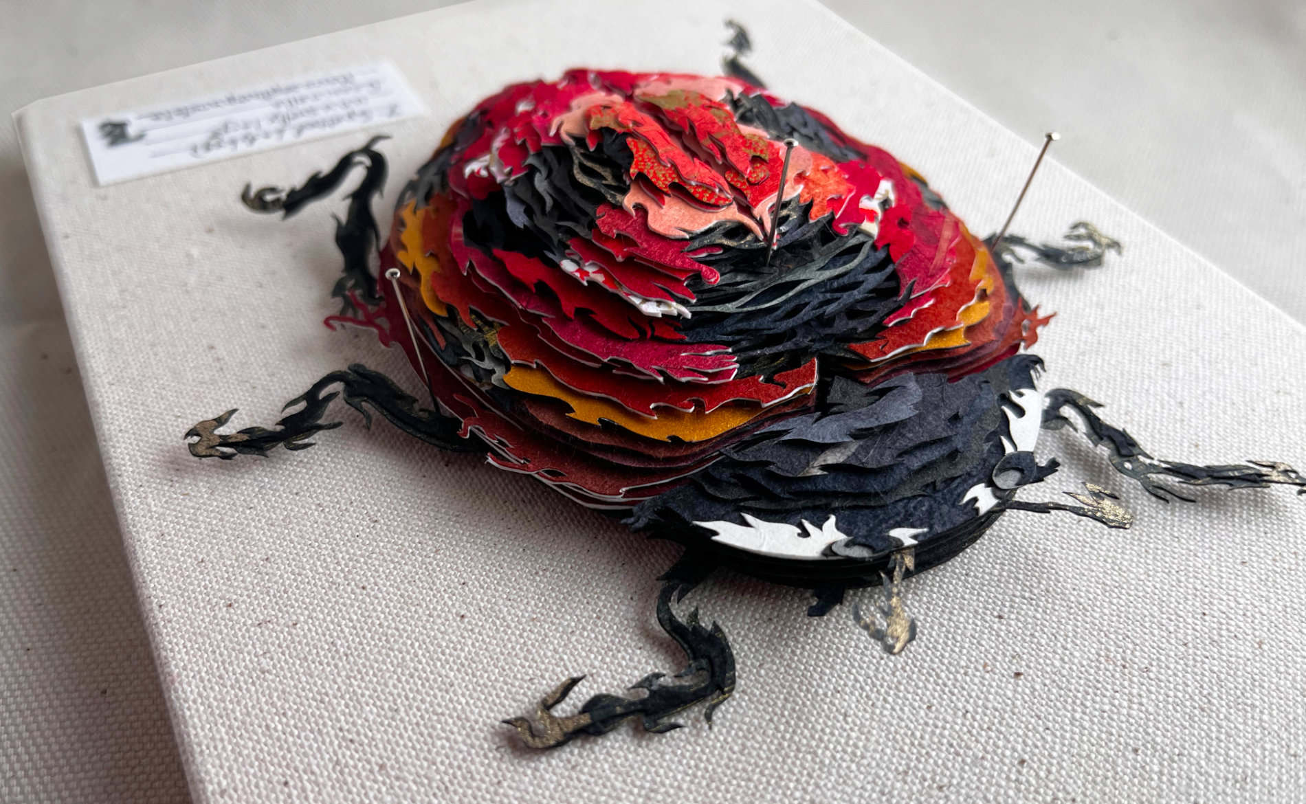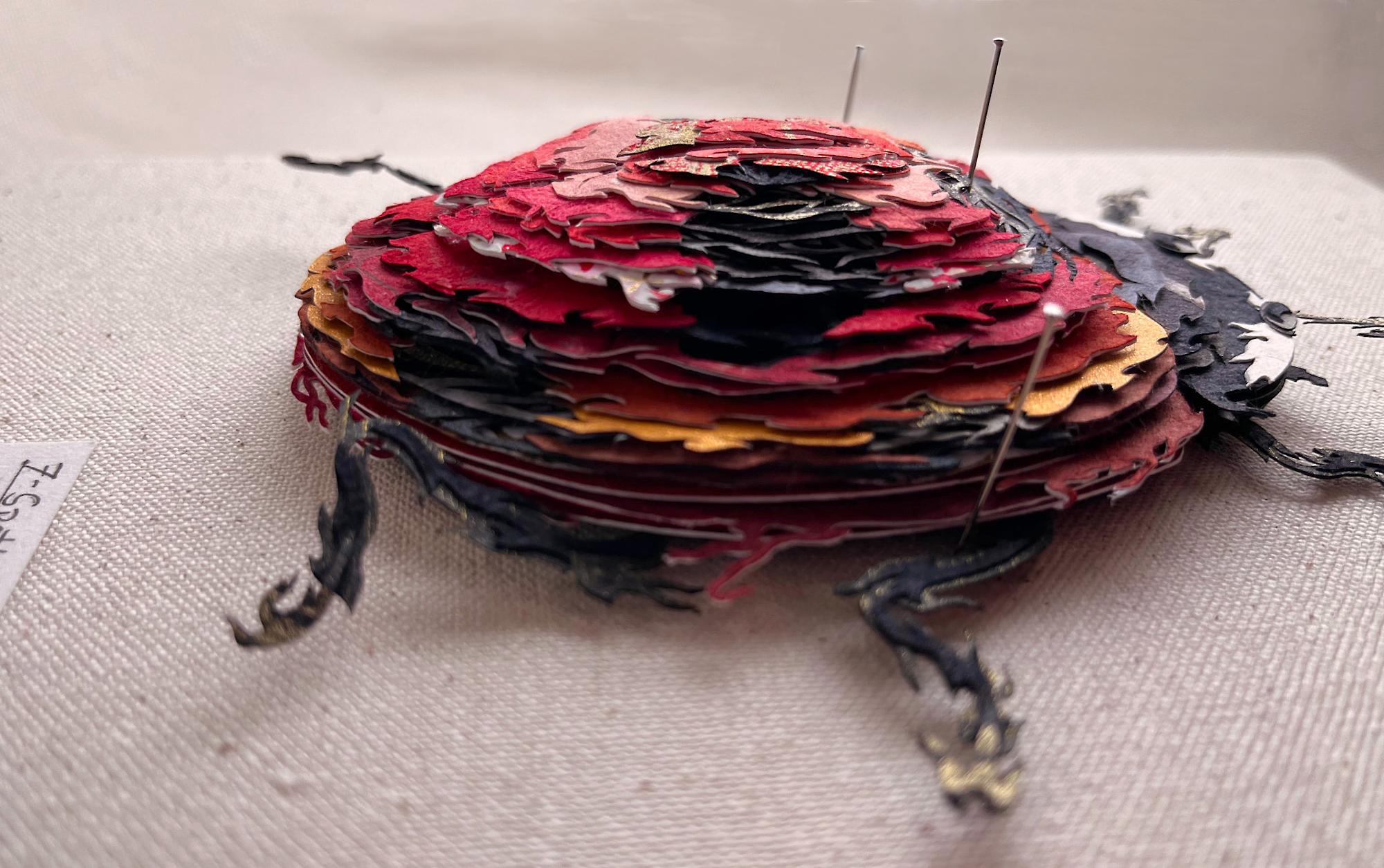 Crafted from vibrant washi and chiyogami papers, this piece eschews a conventional 3 dimensional form. Instead, it is composed of intricately cut and layered 2-dimensional tiers, exploring the play of colors and patterns while shining a spotlight on the illusion of depth. Housed in a repurposed vintage insect specimen display case. Perfect for collectors and nature lovers alike, this elevates any collection.