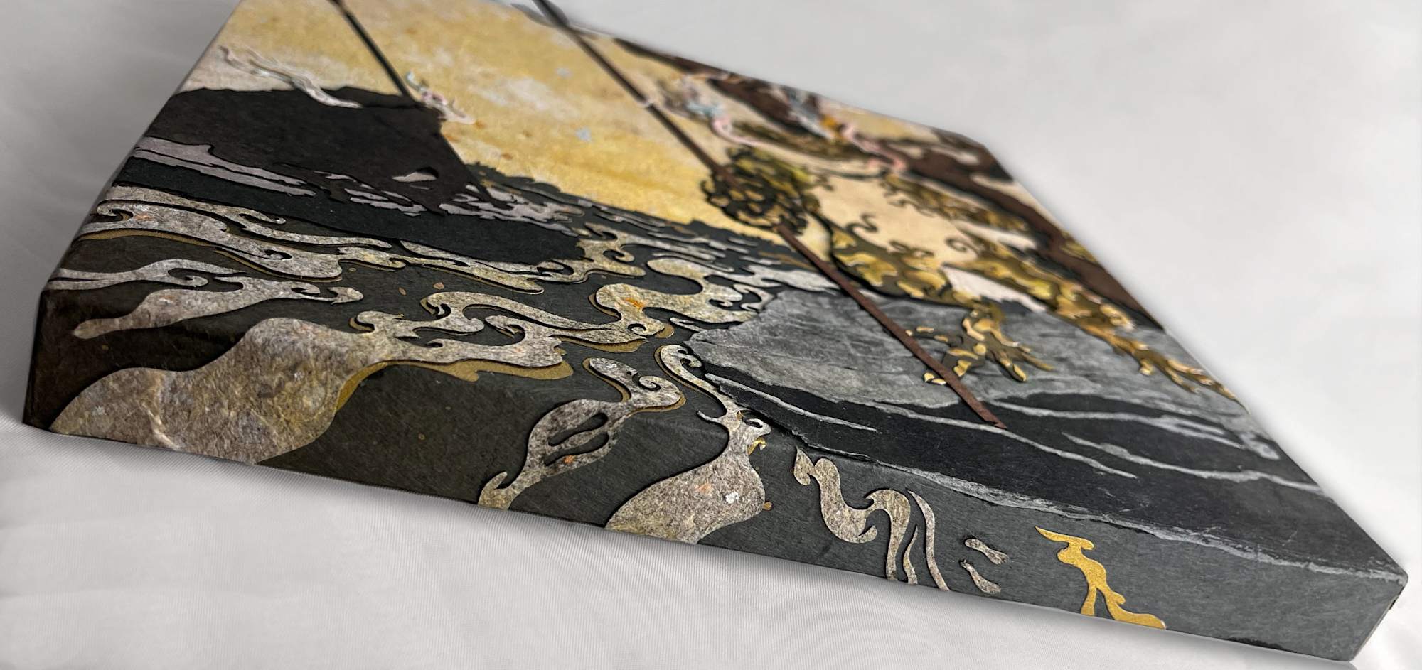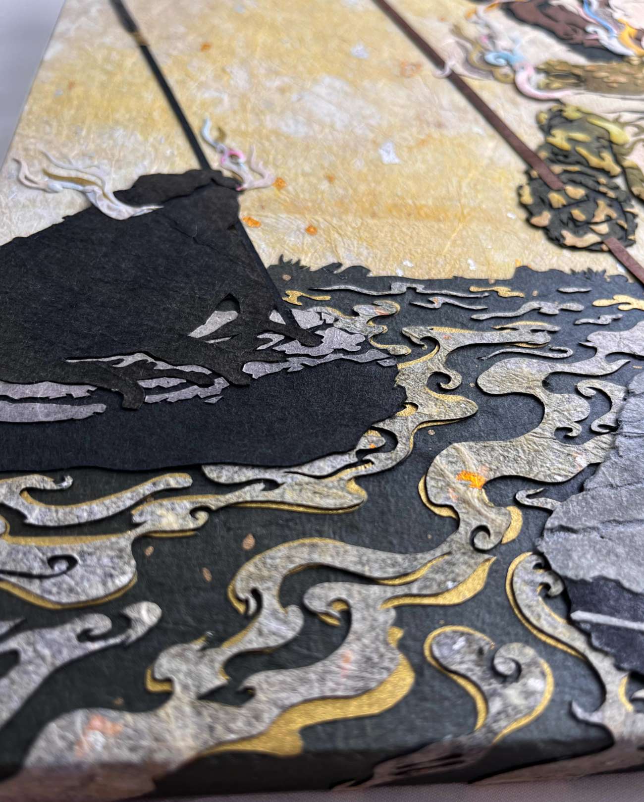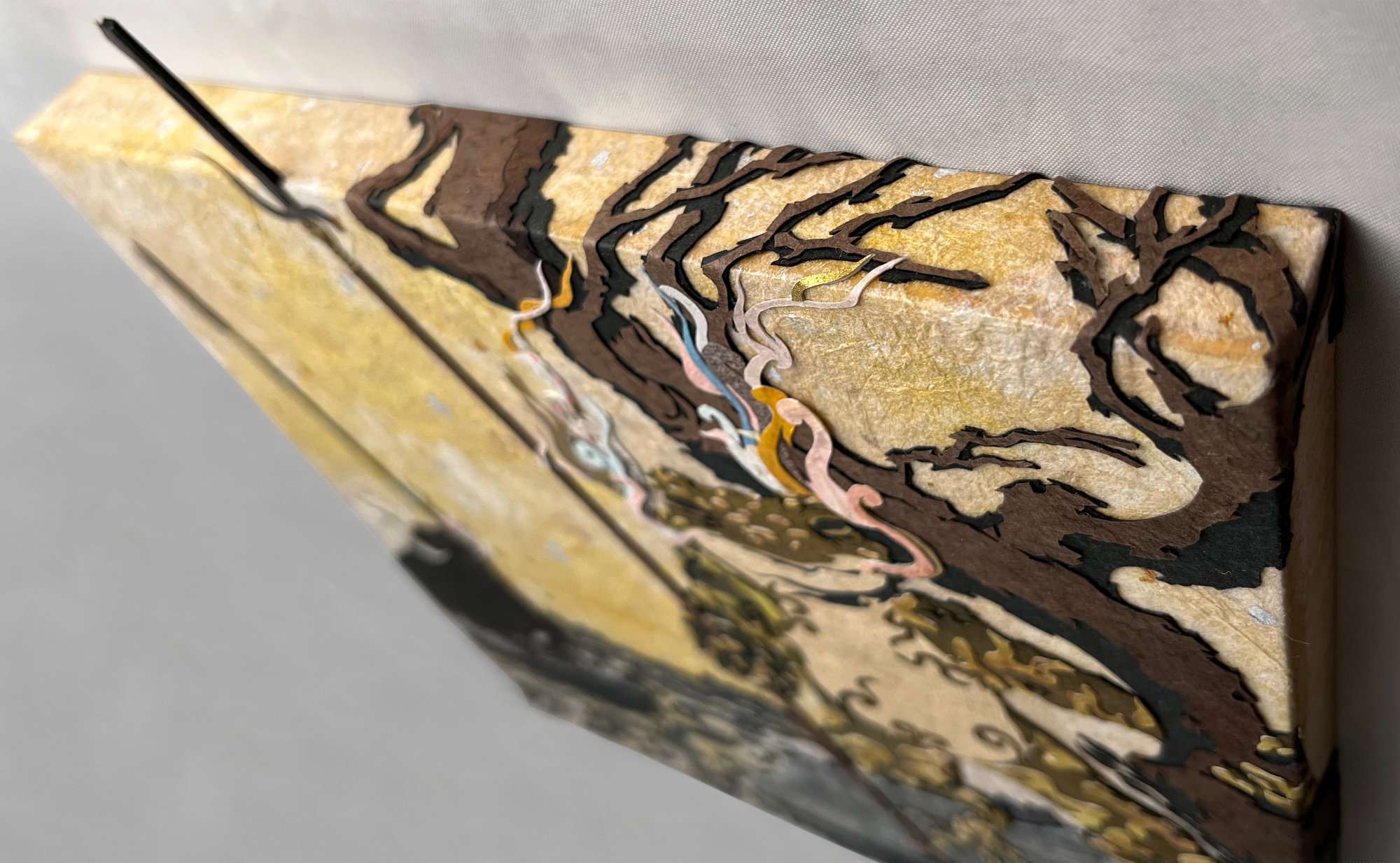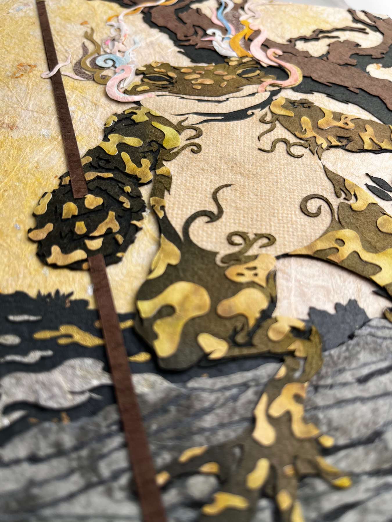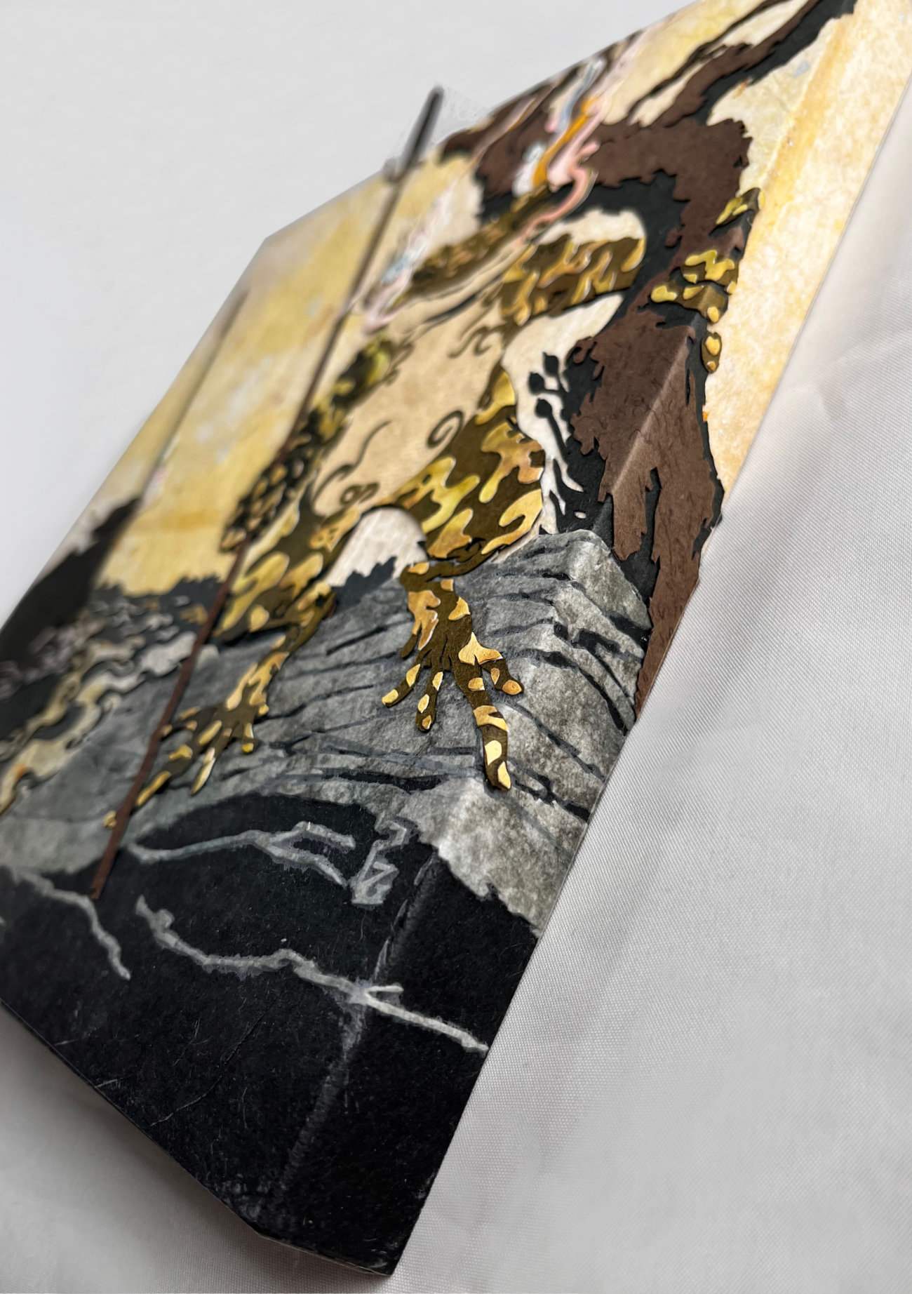 Rich washi and chiyogami papers are skillfully cut and shaped to showcase the majesty and strangeness of nature. Warm golden colors, evoke a sleepy, surreal dream-like emotion.
