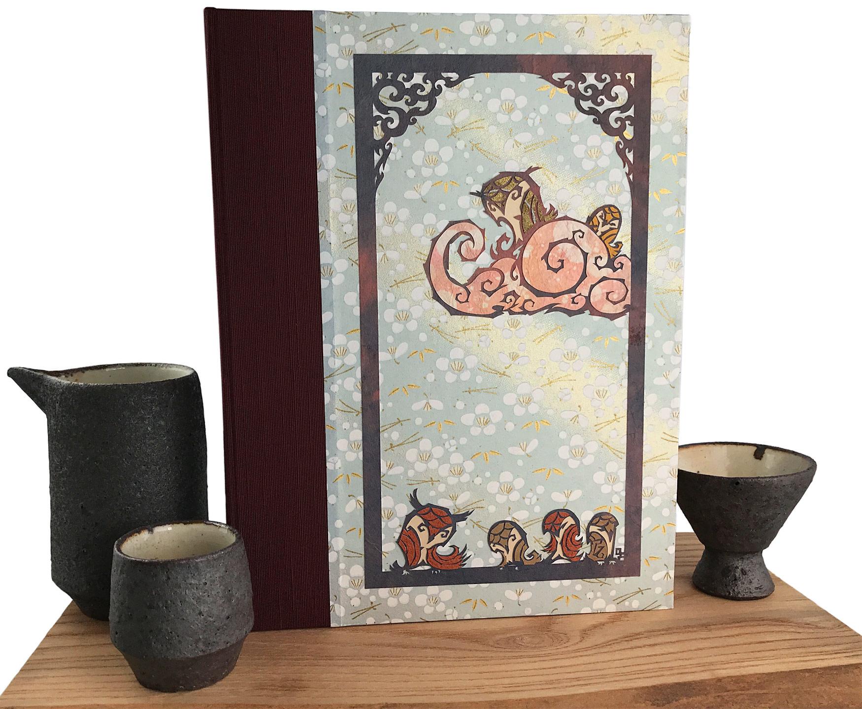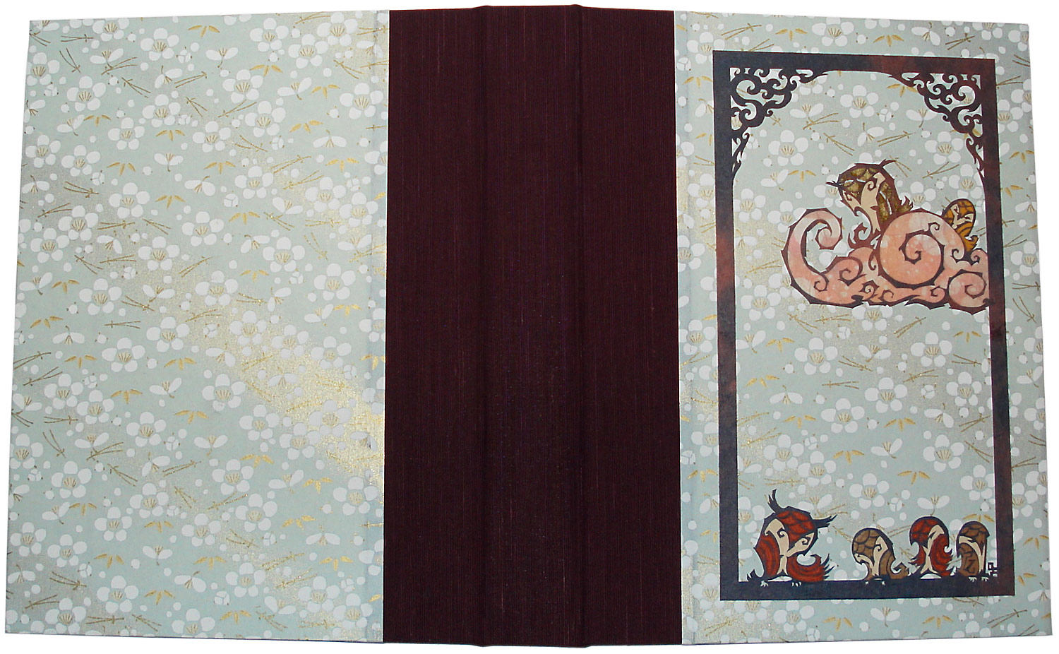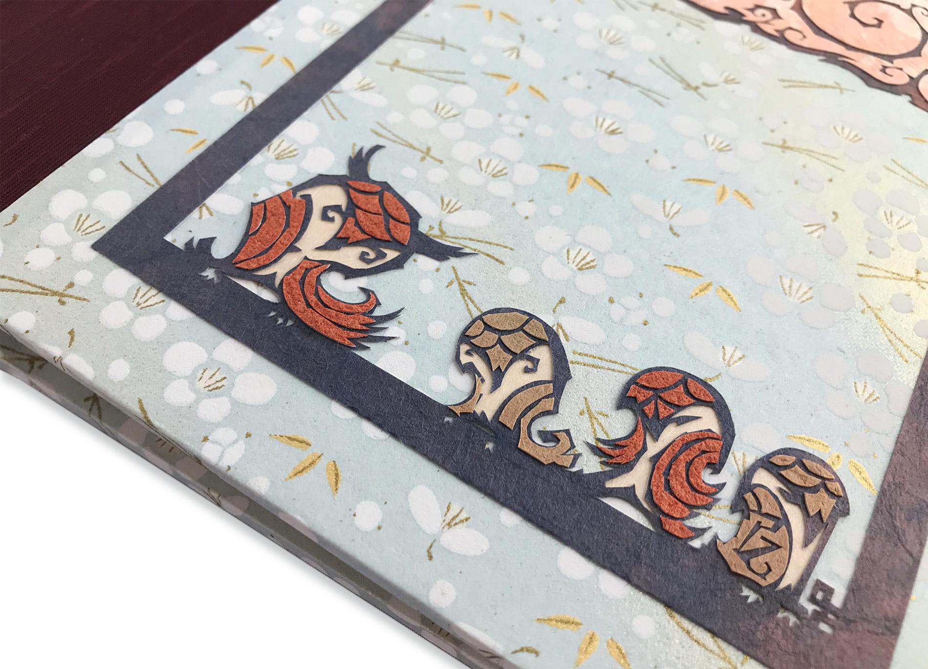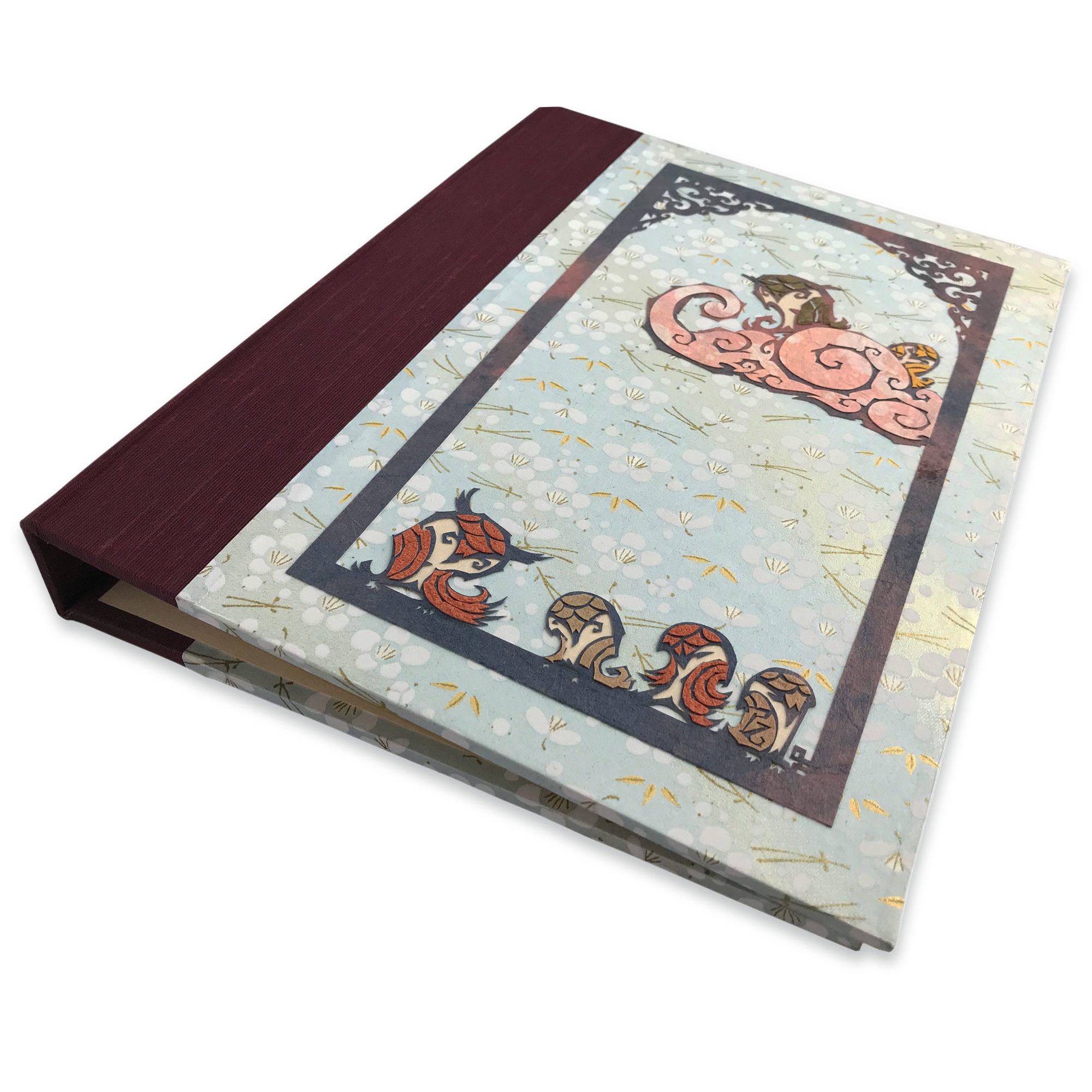 The Iron Resolve of the Golden Owl is a one-of-a-kind hand-bound binder-book. The front and back covers, along with the interior are chiyogami and washi papers, bound with book canvas. The interior binder clip holds 2-hole punch A5 paper. I’ve been using a similar one - without cover artwork - as a gallery guest book for years, and it’s held up wonderfully. While I wouldn’t suggest using this one the same way, it’s a testament to how hardy these books can be.