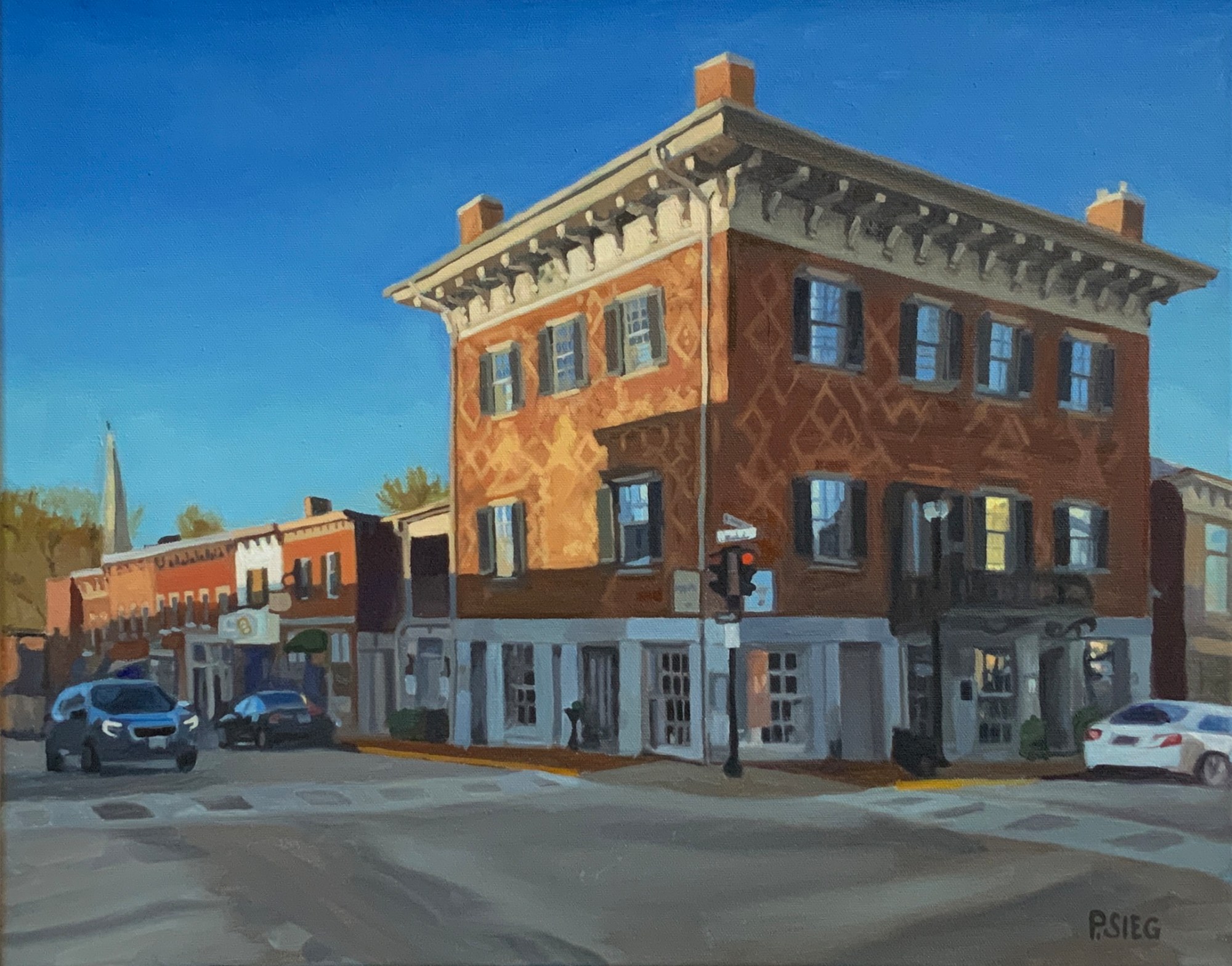 Afternoon light and shadow on the Alexander Withrow House in Lexington, Virginia. Shops including the Cabell Gallery and Lexington Coffee are also in the scene.