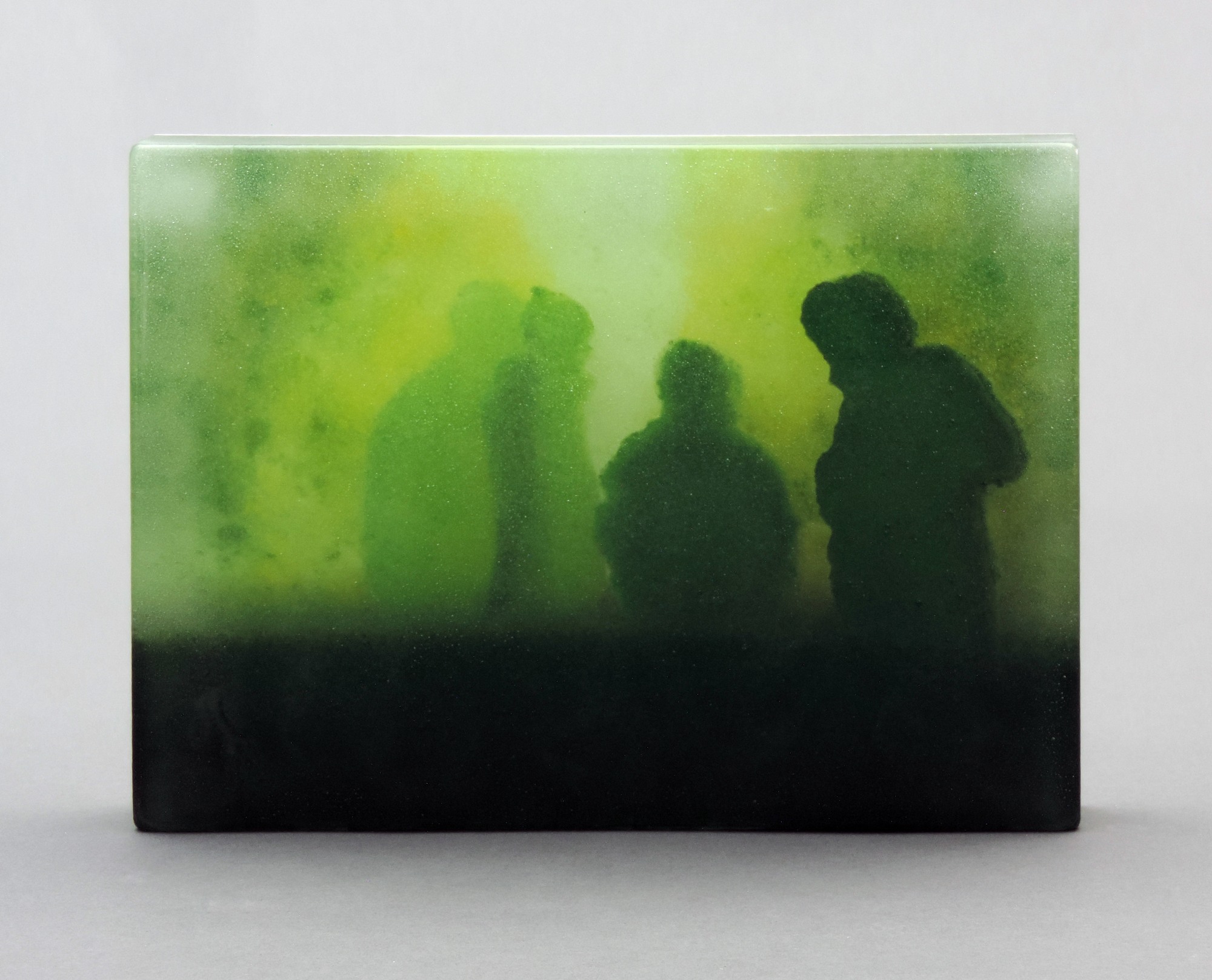 This artwork was made by painting with enamel on 14 individual layers of glass. When all the layers were complete, they were stacked in a kiln and fired to nearly 1500 degrees, turning the stack into a single, solid thick glass panel. With a different part of the image painted on each layer, my artwork exhibits great depth and dimension.