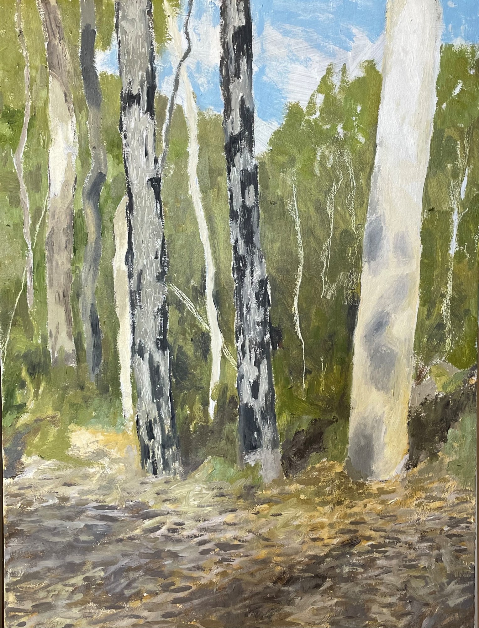 A study of different eucalyptus trees and their bark in the Field of Mars, some burnt by earlier bushfires.
