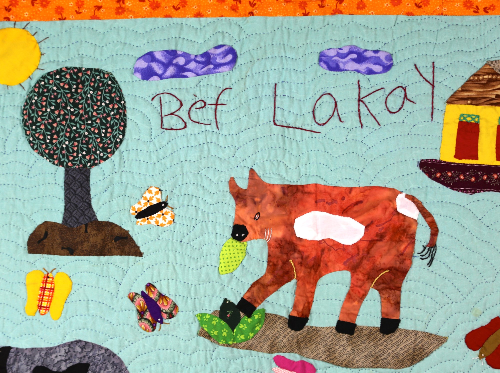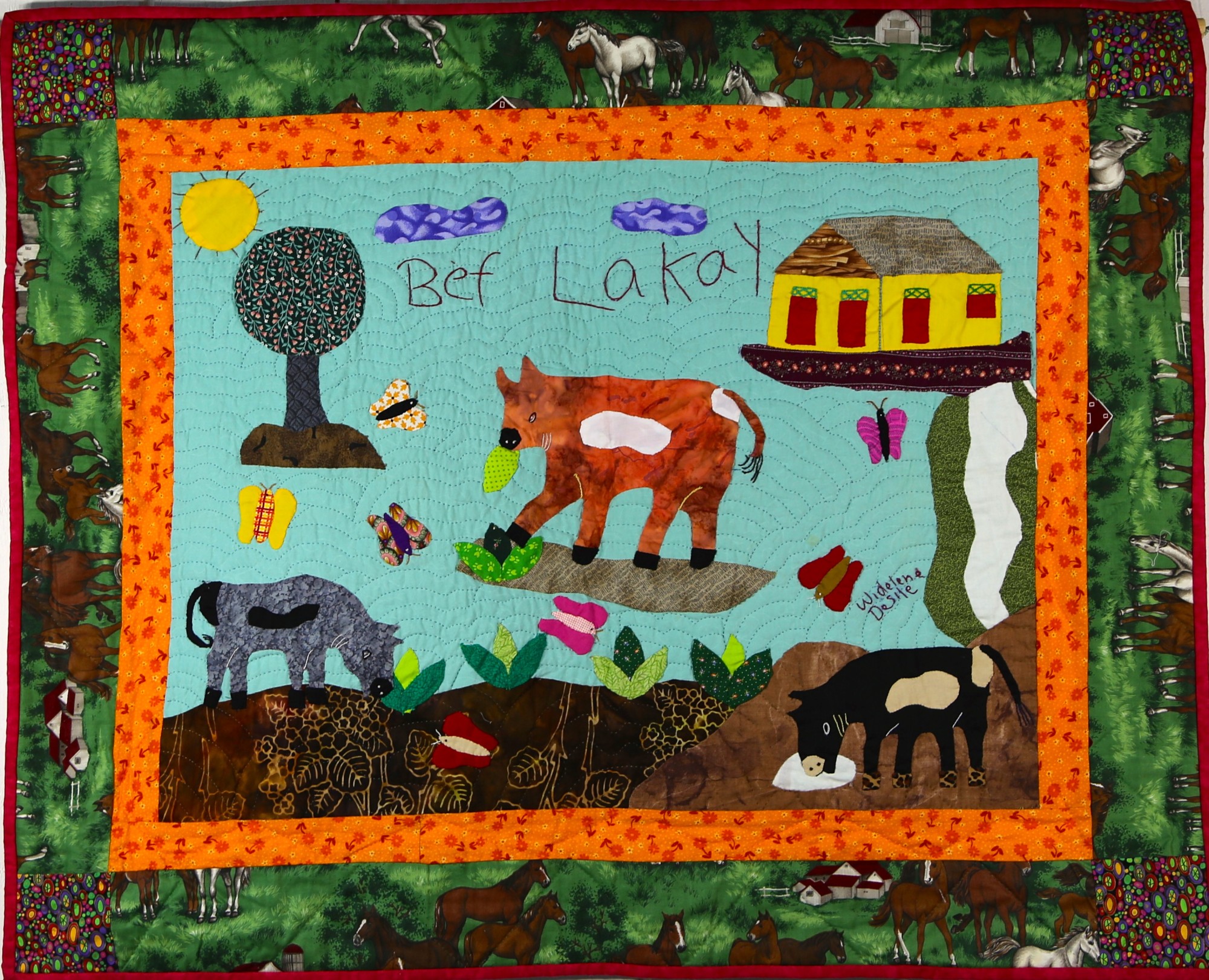 The charms of rural life in Haiti includes a 'ti kay' country house surrounded by cows and fluttering butterflies. Hand-appliquéd, quilted and embroidered, with sleeve on reverse for hanging. Complementary copy of Patience To Raise the Sun included with purchase.