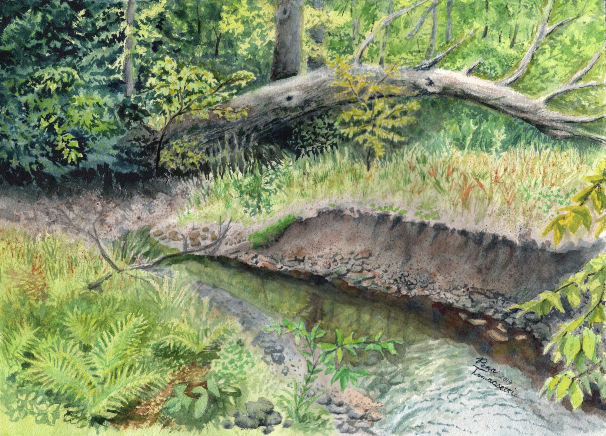 I have good memories of spending time near creeks and in the woods as a child. This scene at Longwood Gardens caught my attention with it's tree fallen to become a bridge for birds and animals across a flowing stream. The sunlight shone through the leaves, causing them to glow with it's warmth.