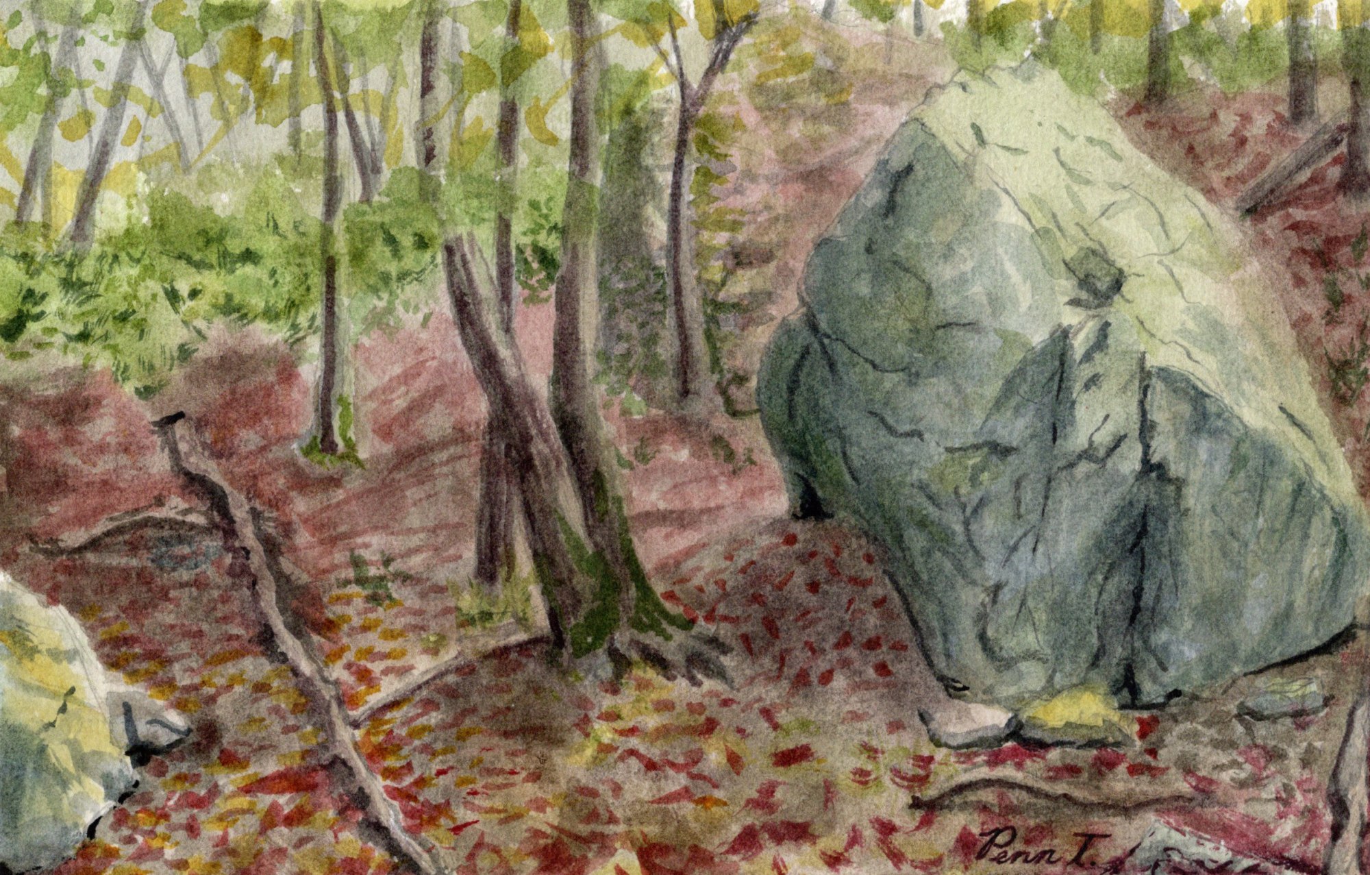 A boulder painted in watercolor outdoors (en plein air) at the Welsh Mountain's "Money Rocks" in beautiful Lancaster County, Pennsylvania. The mosquitos were biting on a cloudy summer day. It began to rain as I left.