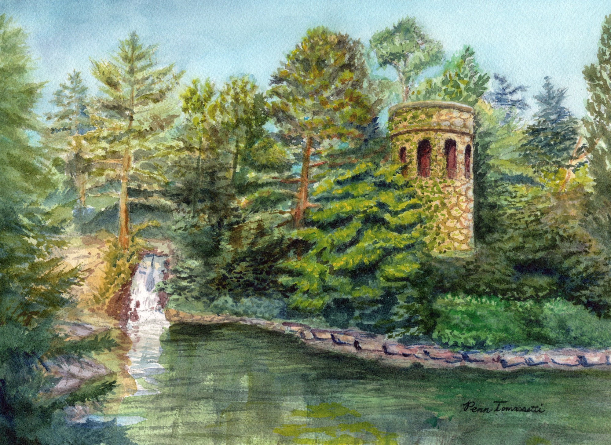 The serene chimes tower and waterfall at Longwood Gardens in Longwood, PA.