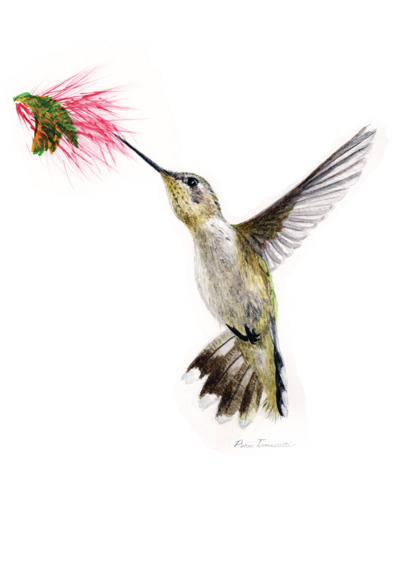 A beautiful female Costa's hummingbird feeding on a Fairy Duster flower (Calliandra eriophylla). Greeting cards of this painting are also available upon request.