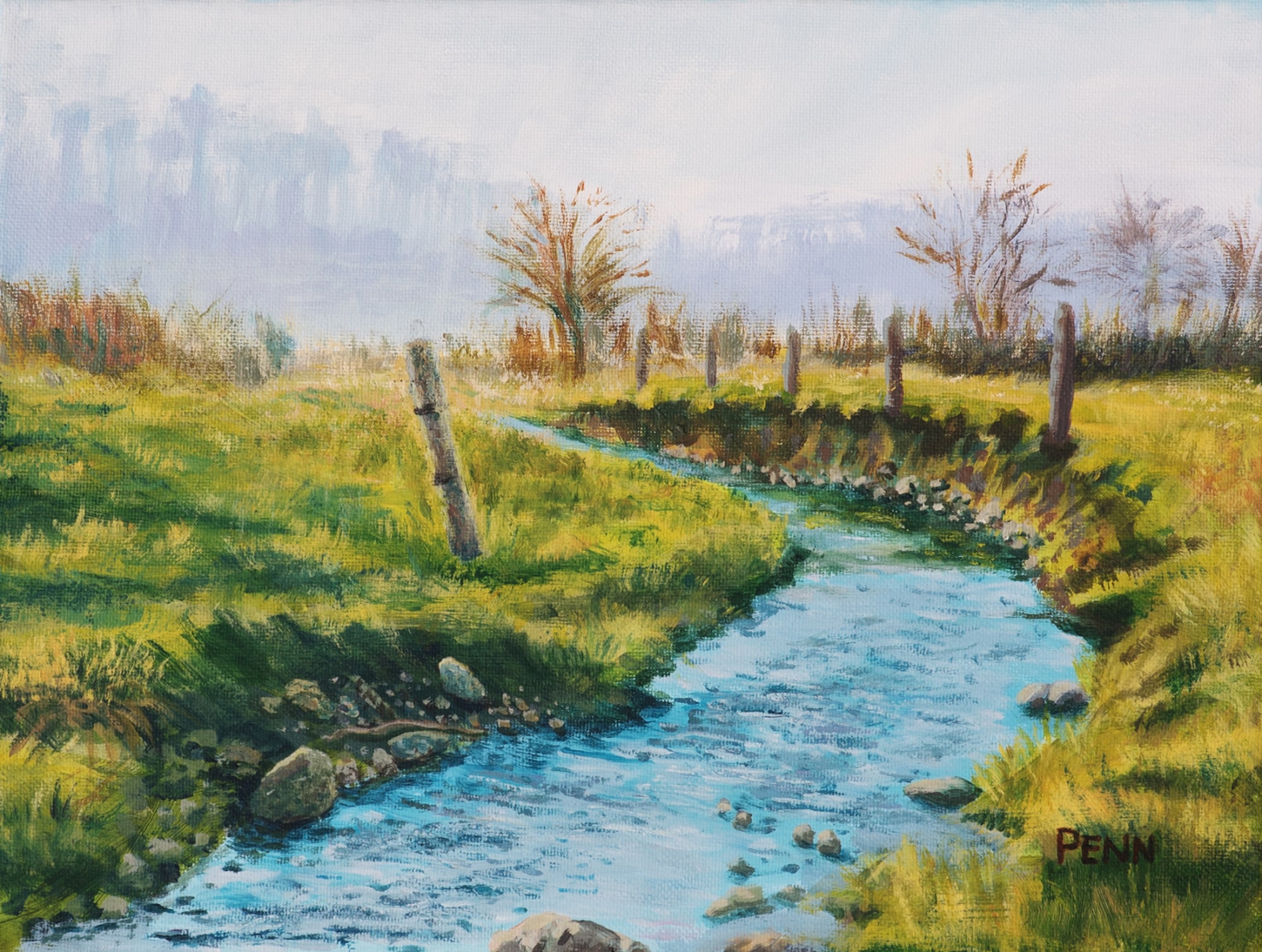 A field stream in beautiful Lancaster County, Pennsylvania. The scene depicts flowing water through a farm field in the morning hours of late Winter / early Spring.
