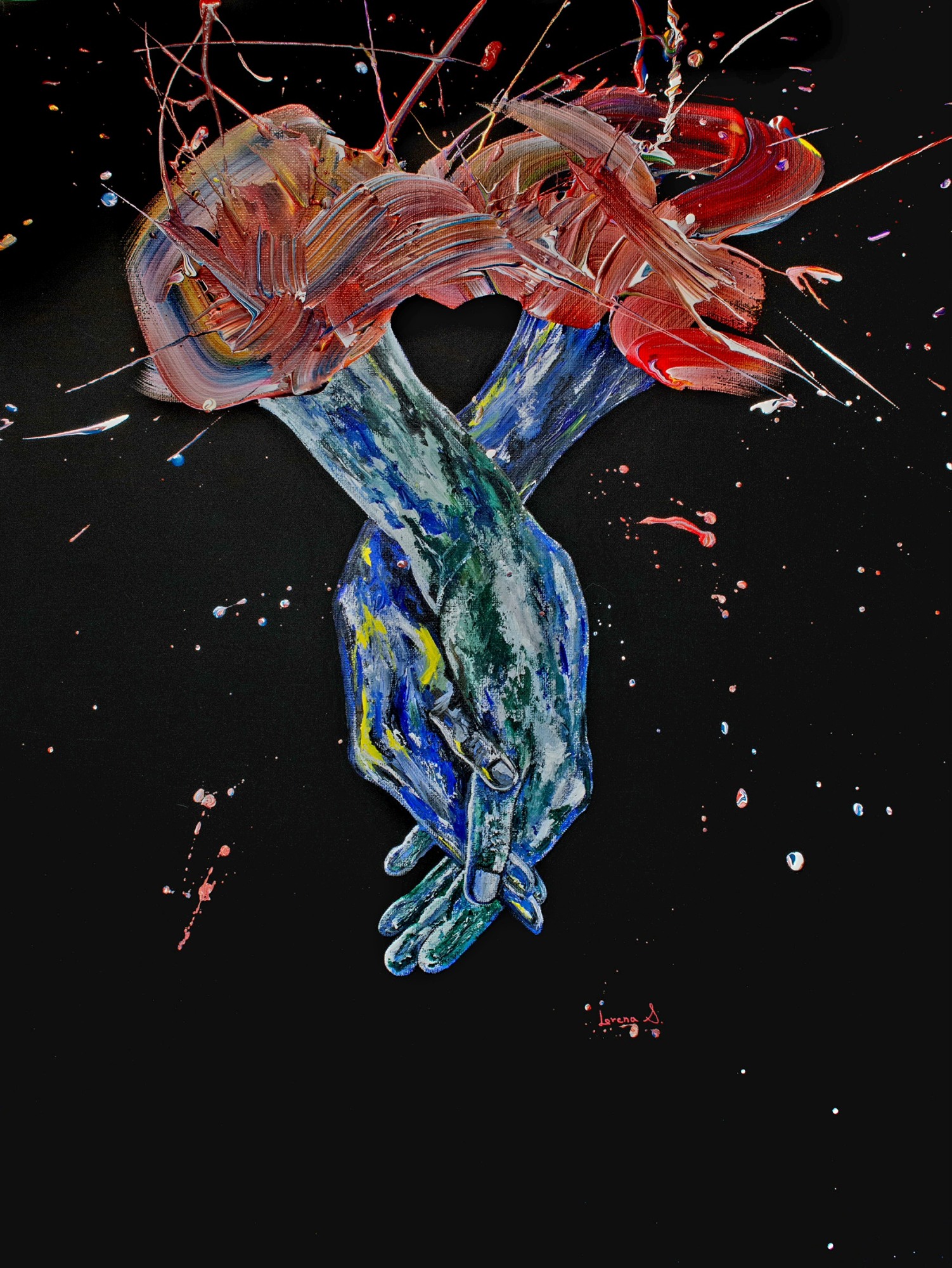 Holding hands creating a deep connection as they can feel each others pulse bouncing off of their bodies creating an explosive emotion that's hard to explain. Many heart shape references within the artwork itself.