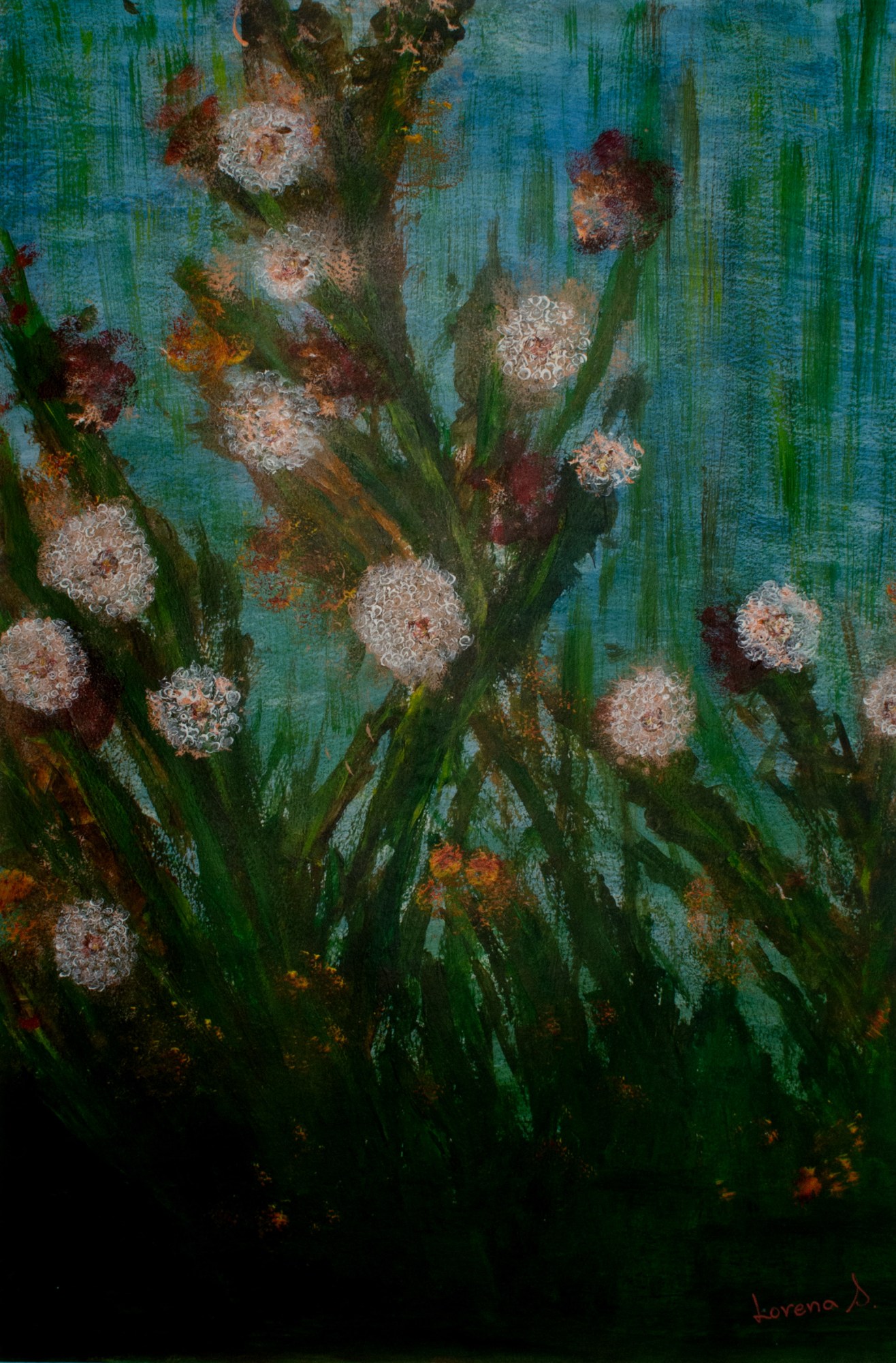 Dahlia Fiona, a flower that has a pom pom shape very representative of the Peruvian pom poms. The flower and stems shape themselves show an X shape. (Part of a diptych)