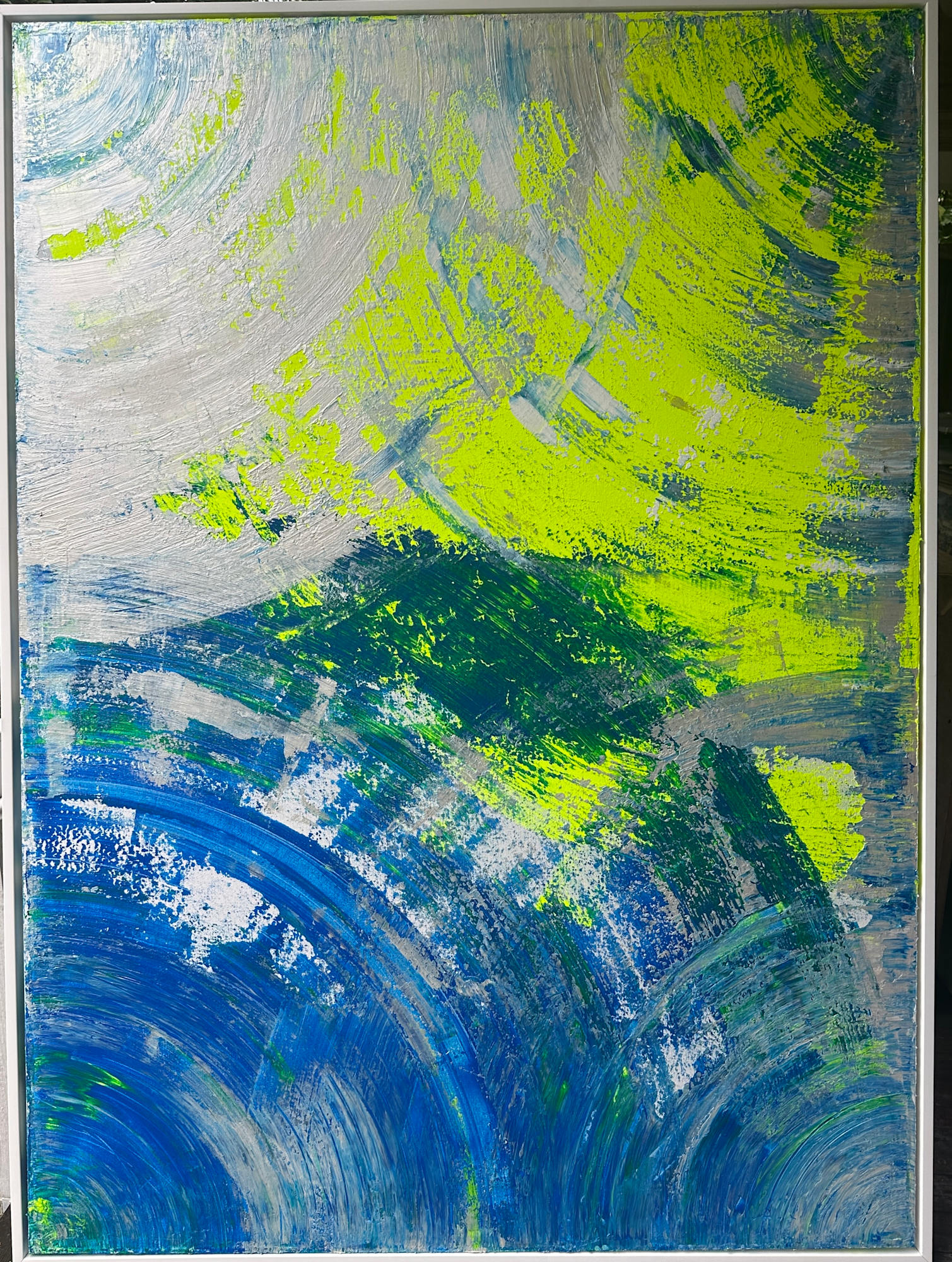 Waves of Radiance radiates with an energetic vibrancy, full of motion and layered textures. Bold strokes of electric lime green surge across the canvas, creating sharp contrasts against cooler tones of cobalt and ocean blues. The whites and silvers break through like flashes of light on water or sky, enhancing the sense of turbulence and luminosity. The circular sweeps and layered textures suggest a natural yet cosmic rhythm—like storms seen from above, waves in perpetual motion, or even the aurora’s shimmer cutting across the night.