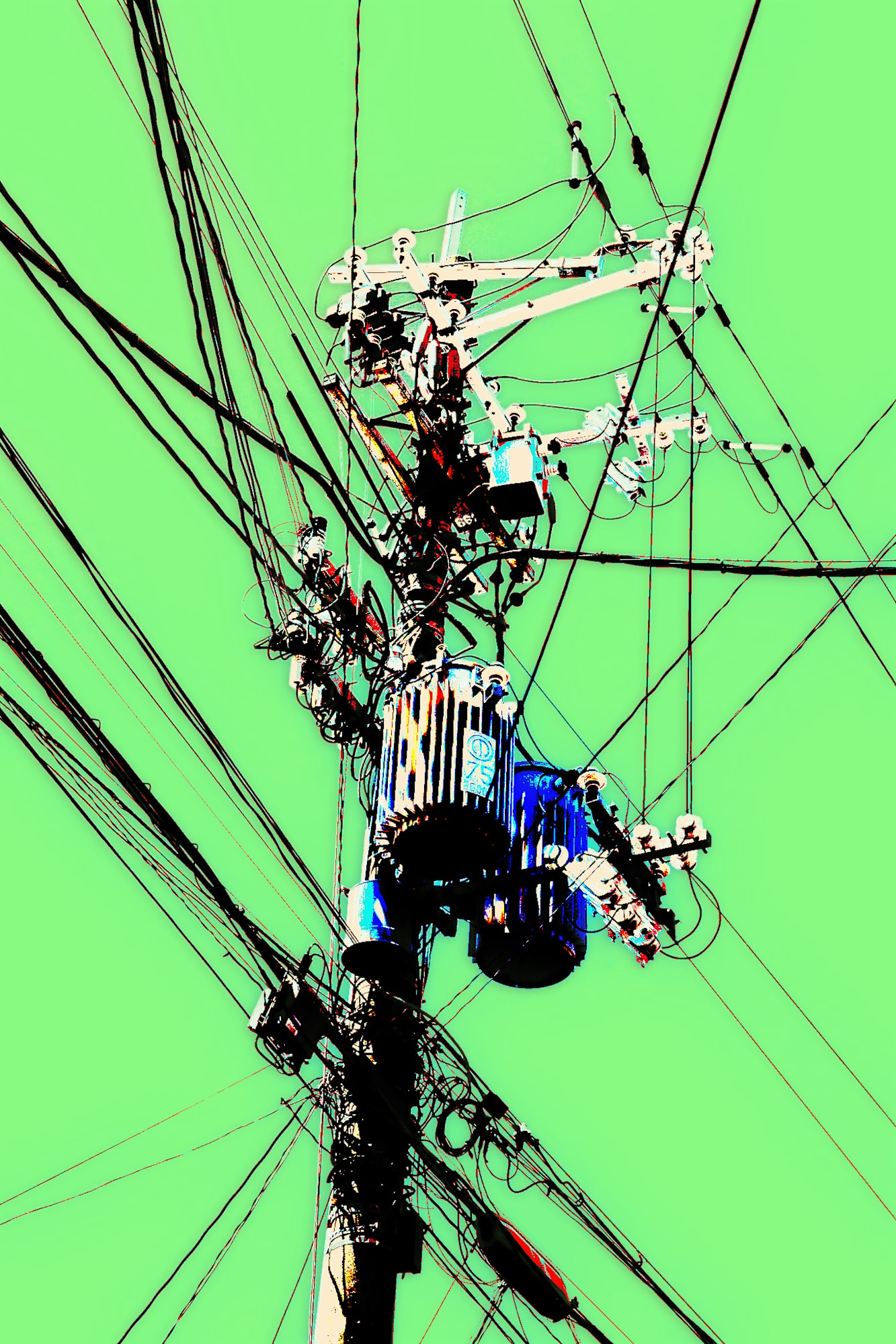 Zoomed in near the top of a single power pole, this image reveals the frenetic infrastructure behind everyday energy delivery. A pair of cylindrical transformers sit just below the crossarms, surrounded by a mess of cables running diagonally across the frame. The visual tangle evokes disorder, but it works—a persistent system stretched to its functional edge, still delivering electricity, data, and voice to homes.