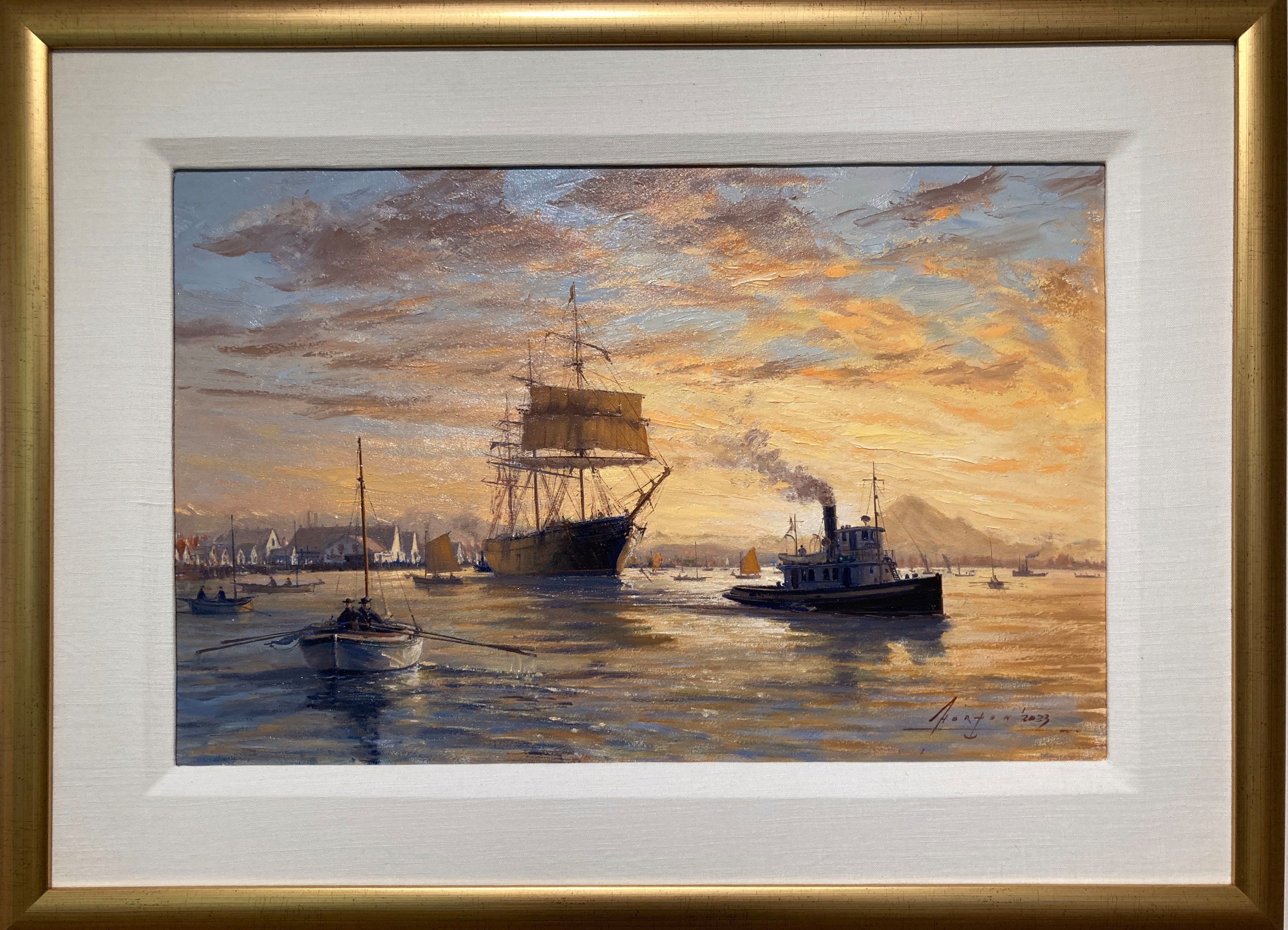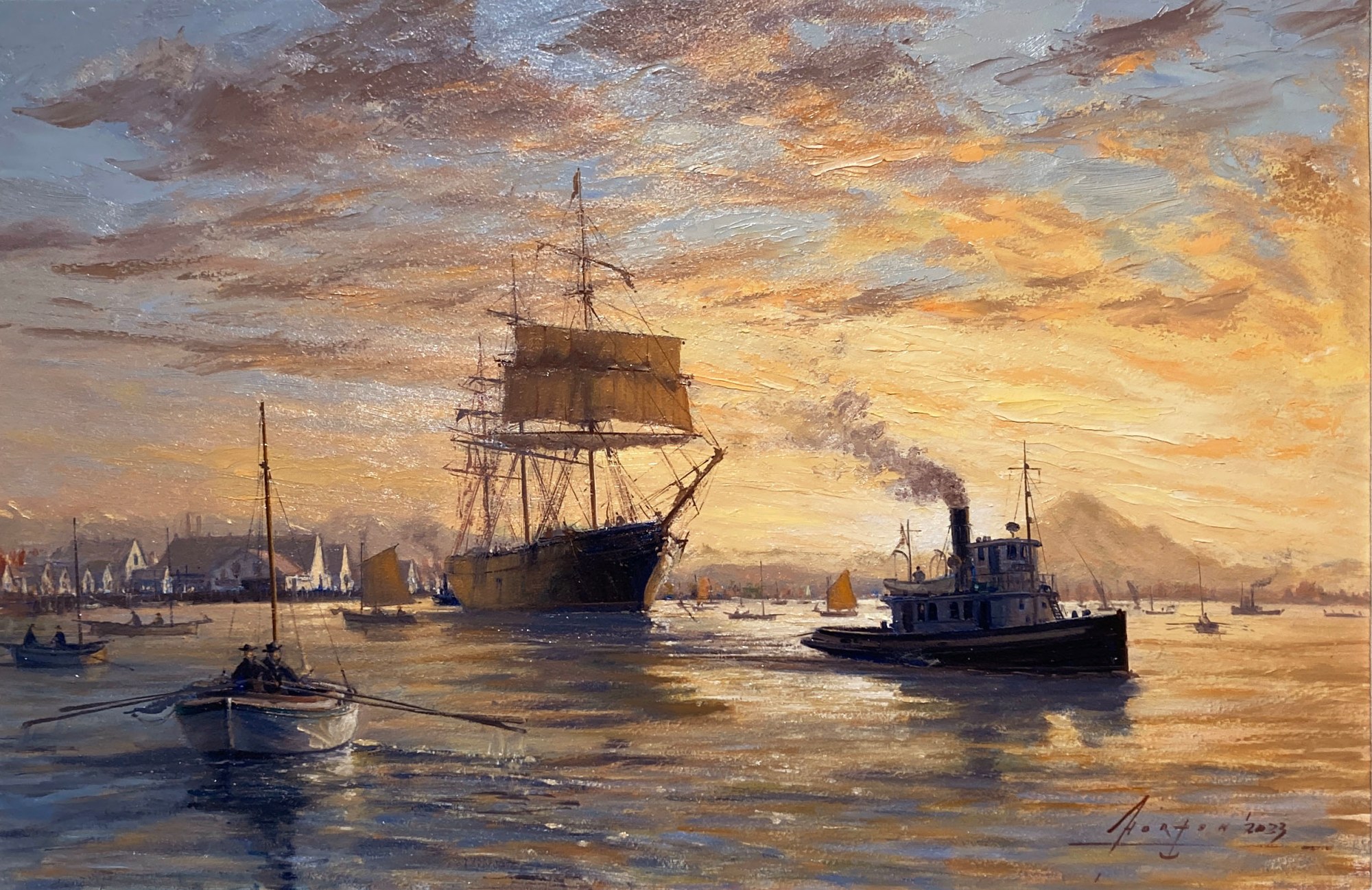 This historic view of Steveston illustrates a tall ship being towed away from the Britannia Cannery early in the morning.
