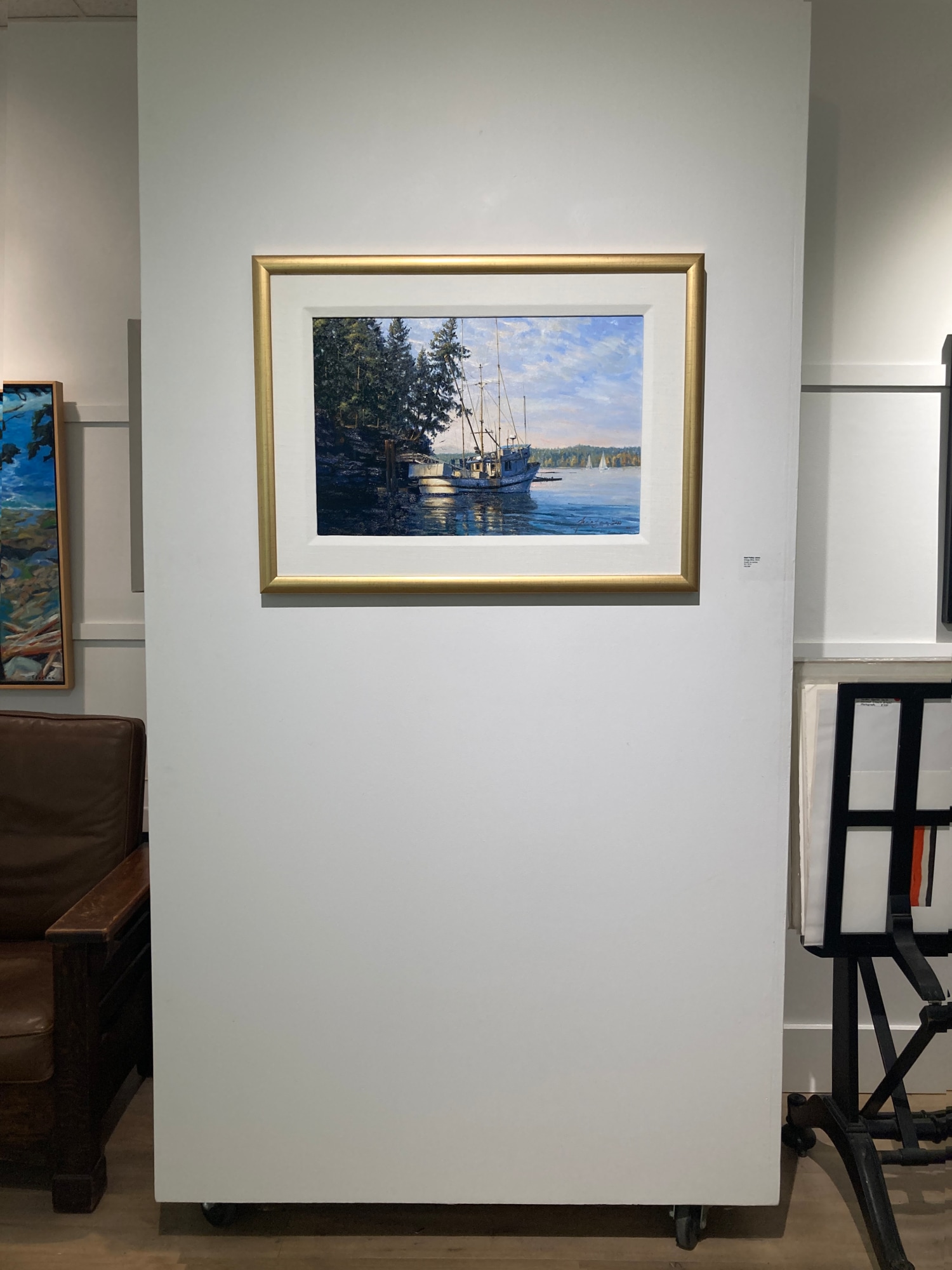 The exciting thing about this view is that it allows one to play with dappled light as it filters through the trees playing on the fishing vessel and the water. Hopefully it has a calming effect upon the viewer.
