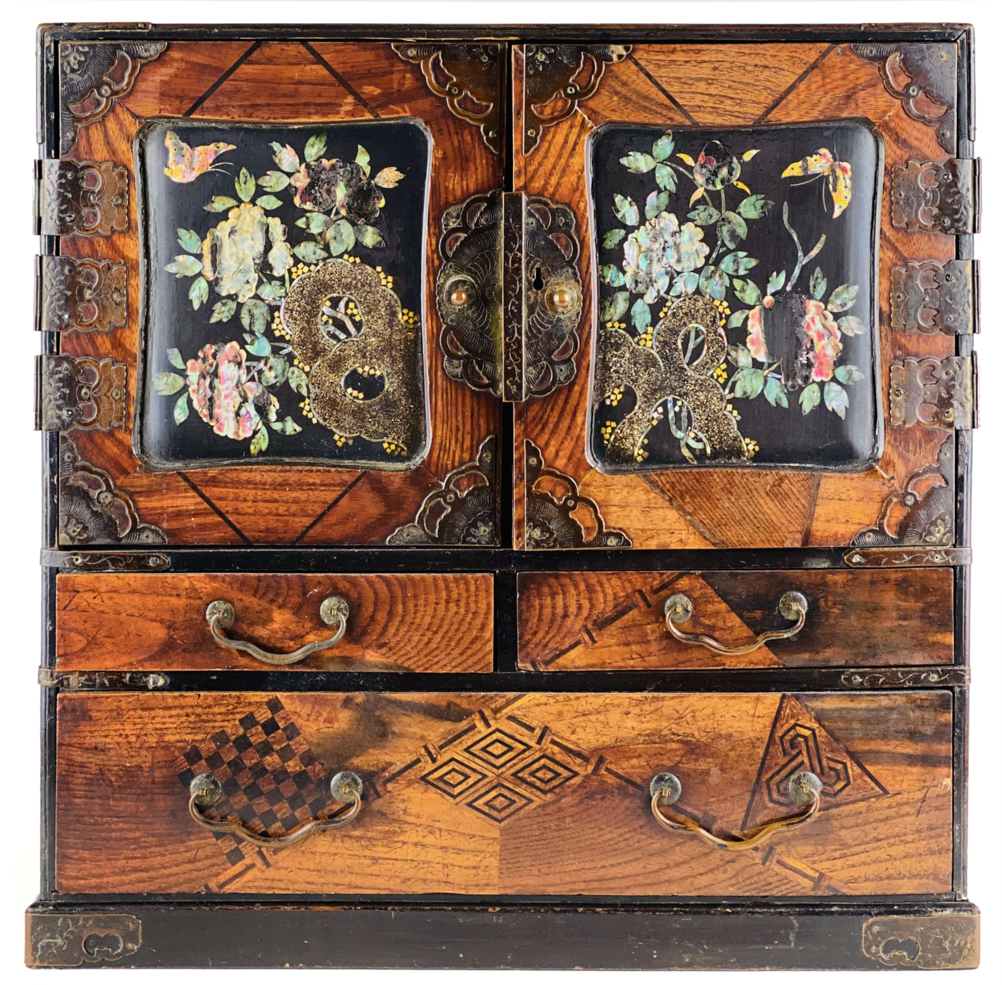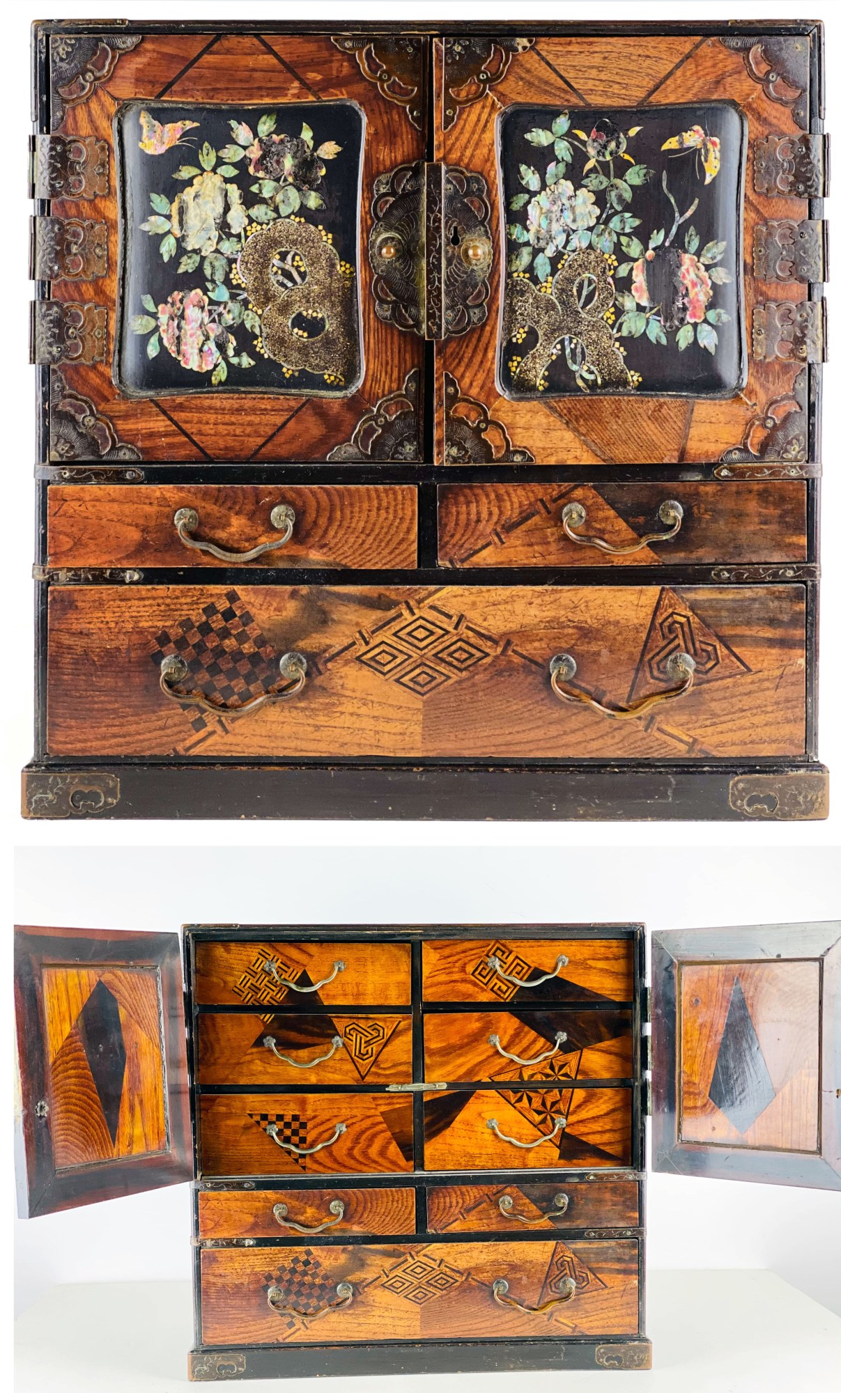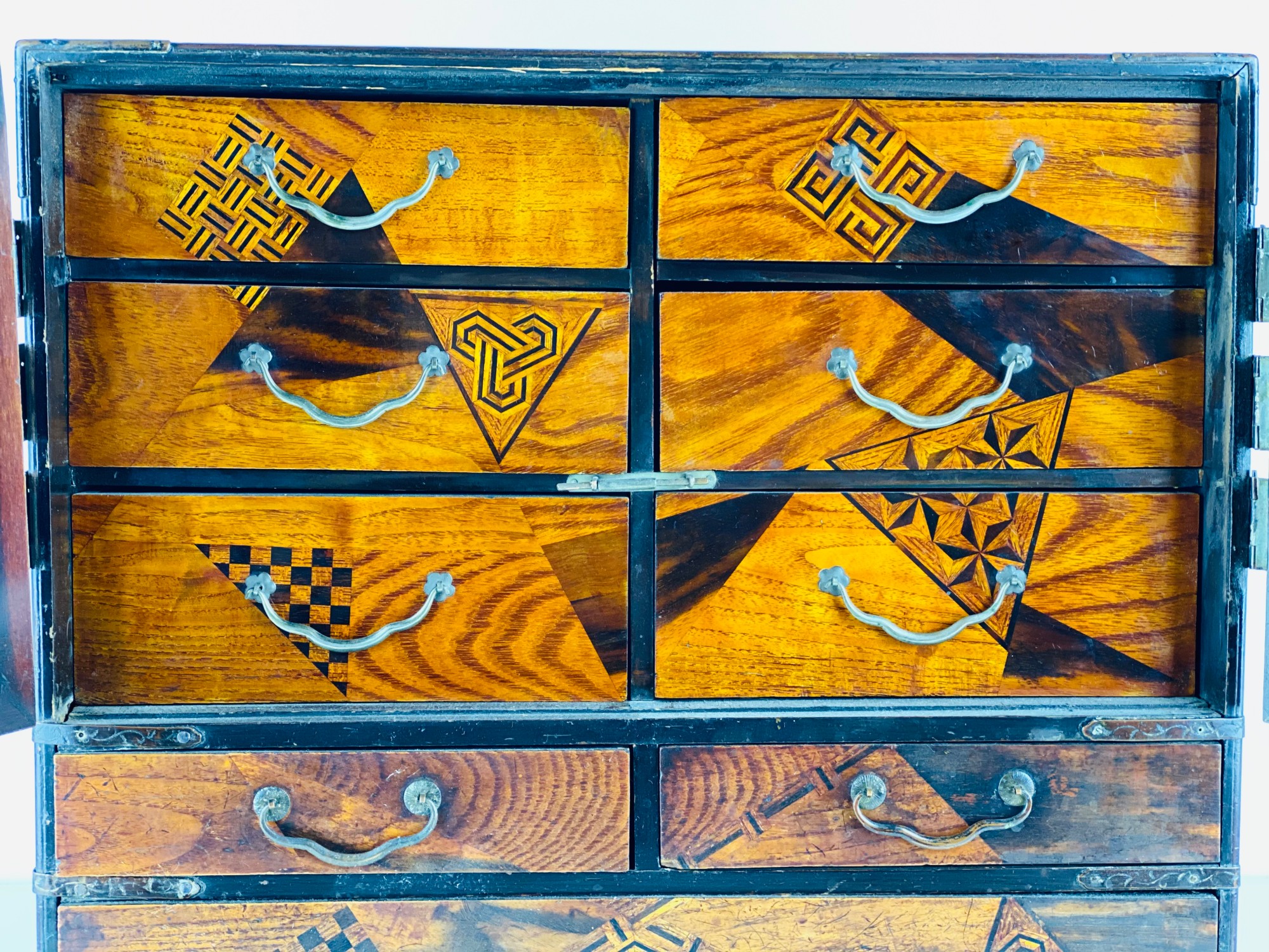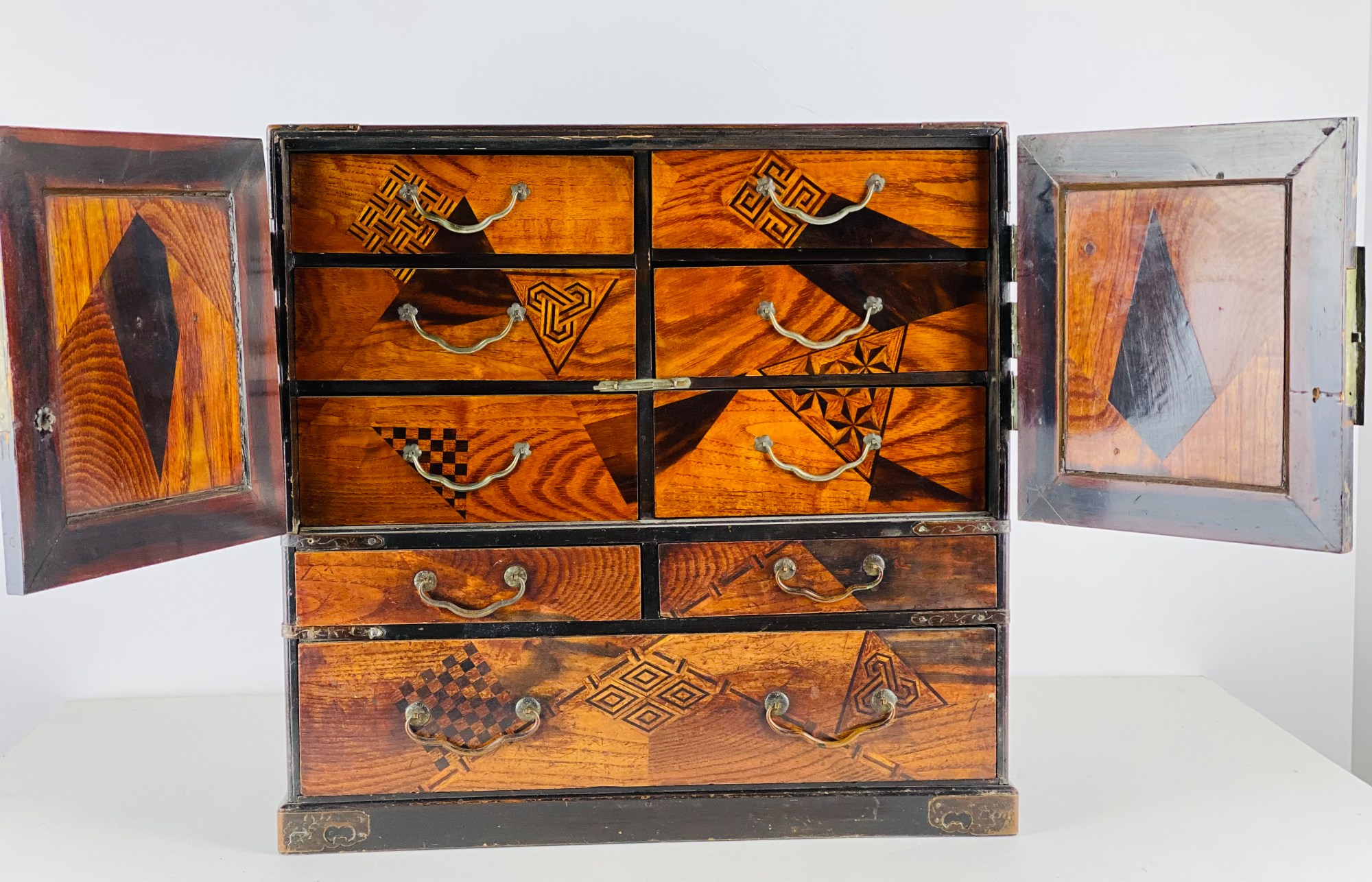 MessageThis Japanese chest with drawers, circa the 1920s, features intricate traditional woodworking techniques, including Yosegi. Resembling a type of mosaic, yosegi is created through the combination of fine oblong rods of wood chosen for their grain, texture and colour, and is well-known for its intricately patterned nature.