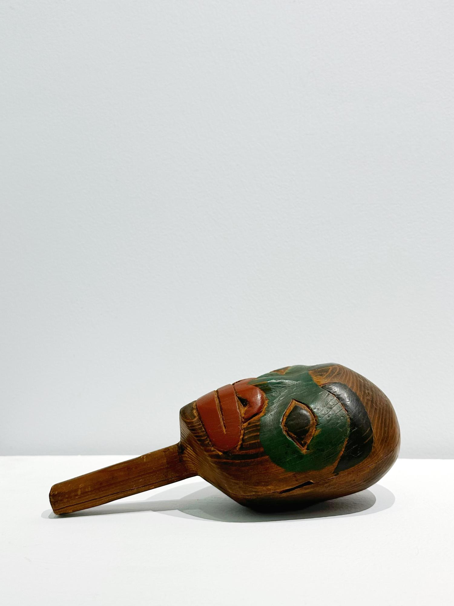 According to art historian Bill Holm, these rounded, hemispheric form rattles may be associated with the shape of a human skull, and thus employed by shamans as a visual metaphor.