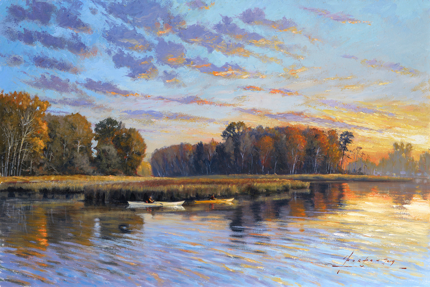 The tranquility of a dawn in the Ladner marshes is enjoyed by two kayakers as they enjoy being close to nature. Fall colours create a warm glow as the day begins.