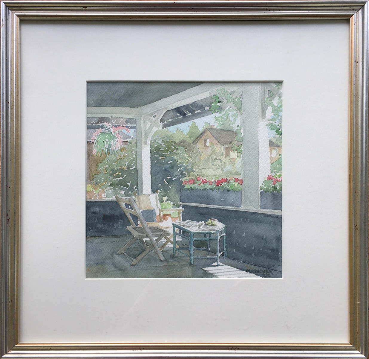The porch of an old Kerrisdale house in summertime, with a newspaper and coffee cup in a band of sunlight. It appeared as an illustration in the book "British Columbia in Watercolour."