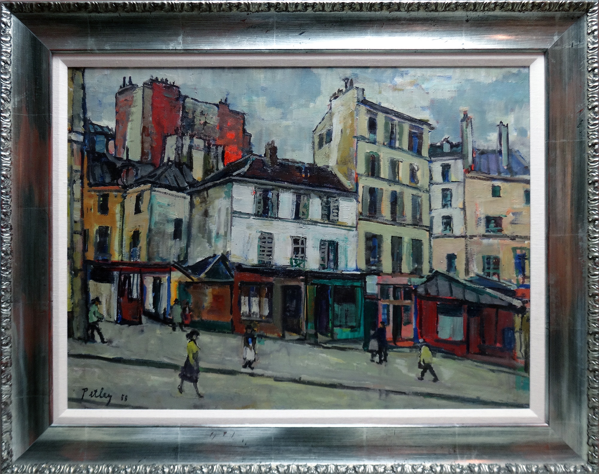 This artwork depicts the Rue de la Montagne Sainte Geneviève, outside of the Pantheon in Paris.