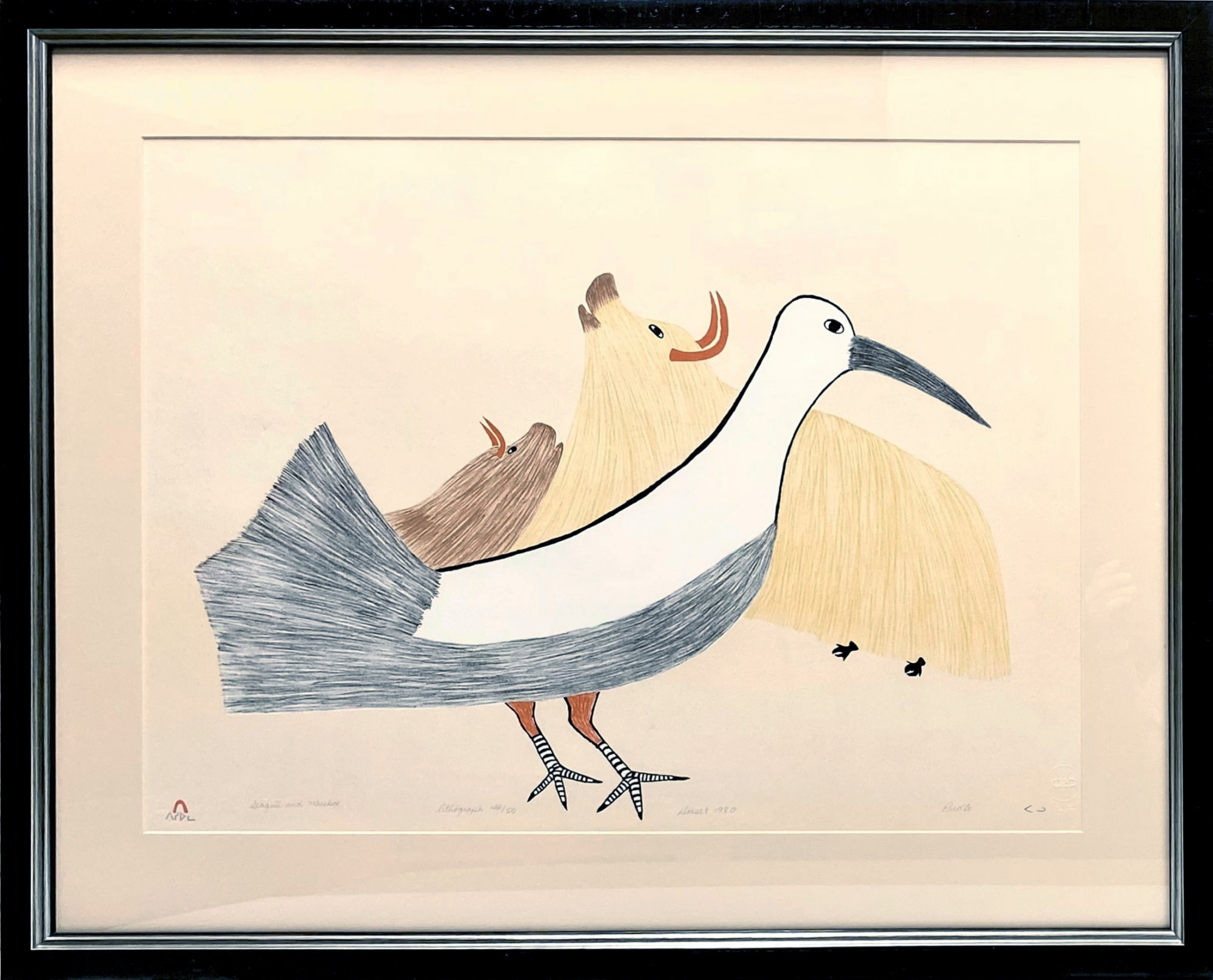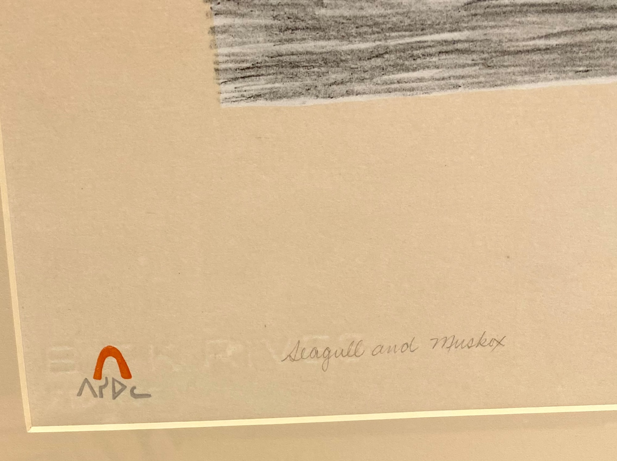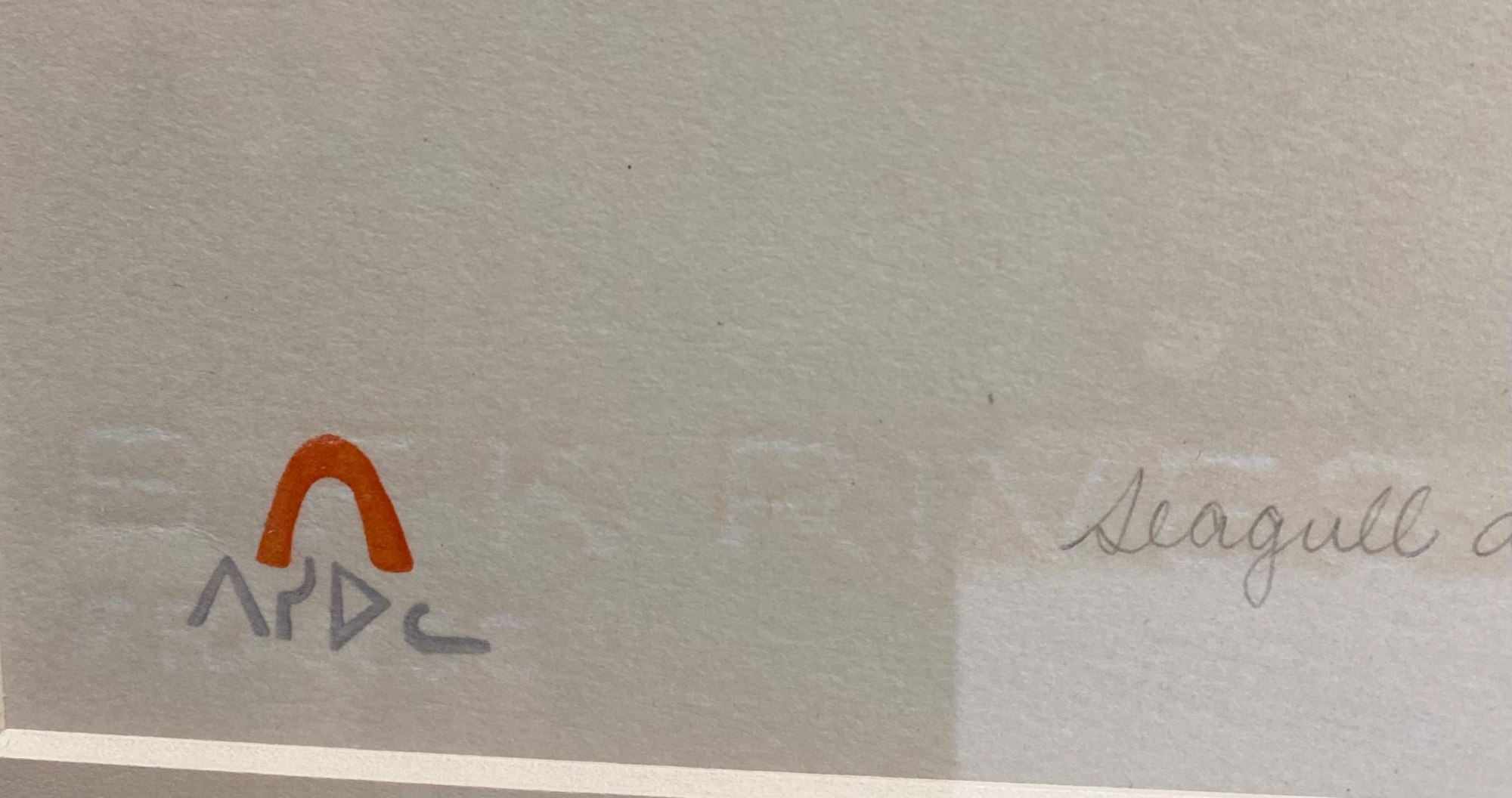 Signature: Seagulls and Muskox lithograph 44/50 Dorset 1980 Pudlo Left side syllabic: ᐱᓯᐅᓚ Right side syllabic: ᐸᓗ