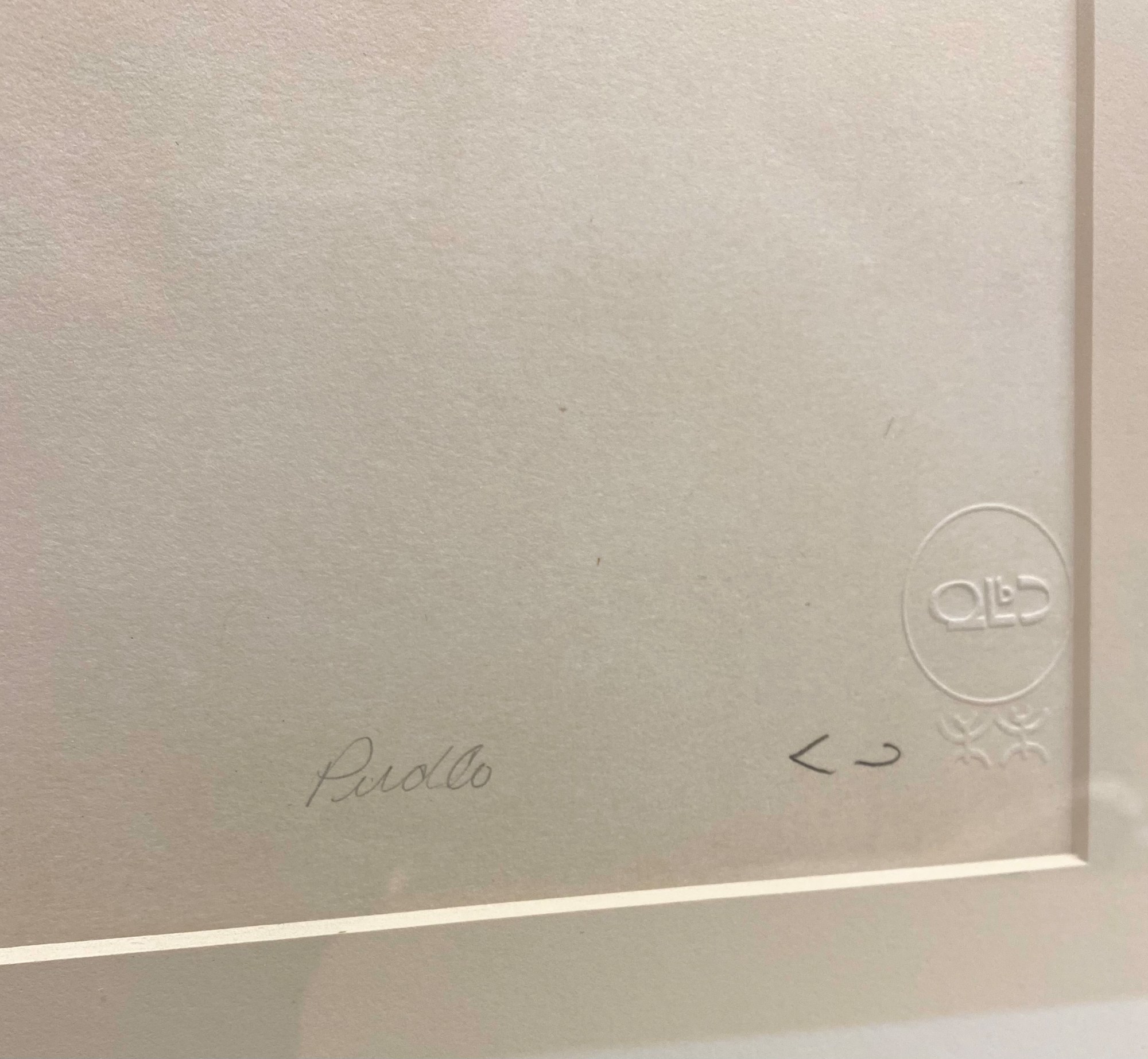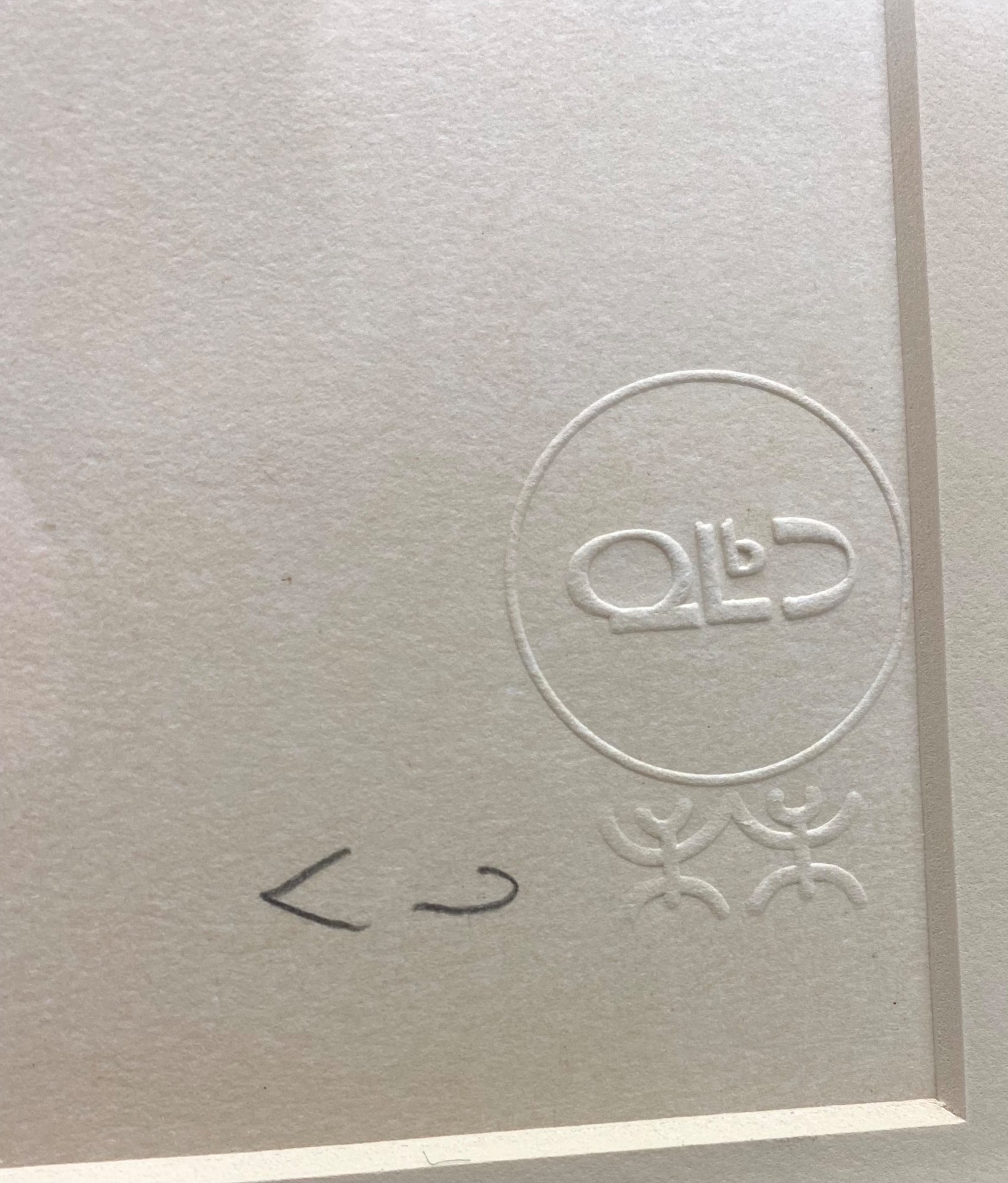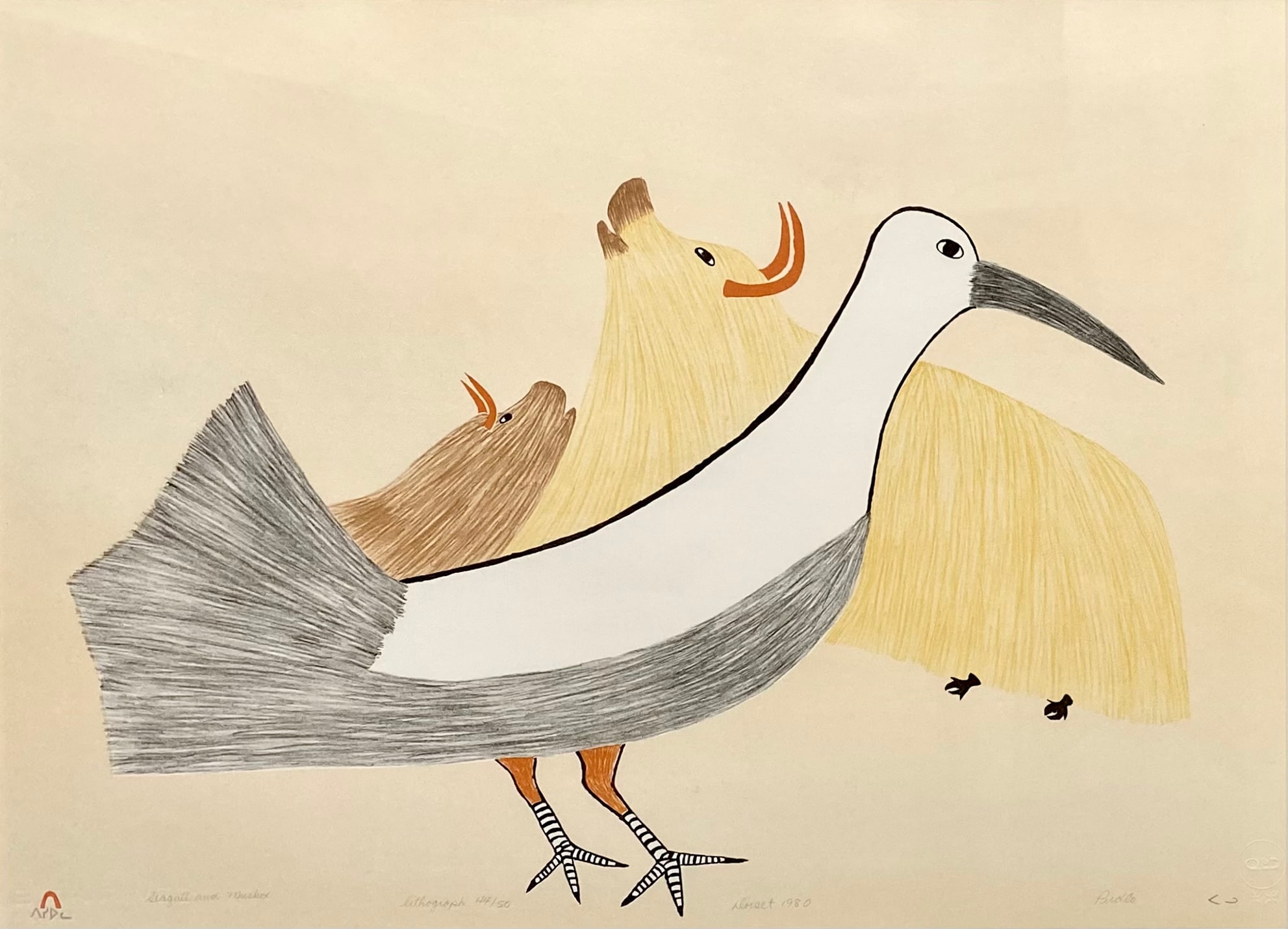 Signature: Seagulls and Muskox lithograph 44/50 Dorset 1980 Pudlo Left side syllabic: ᐱᓯᐅᓚ Right side syllabic: ᐸᓗ