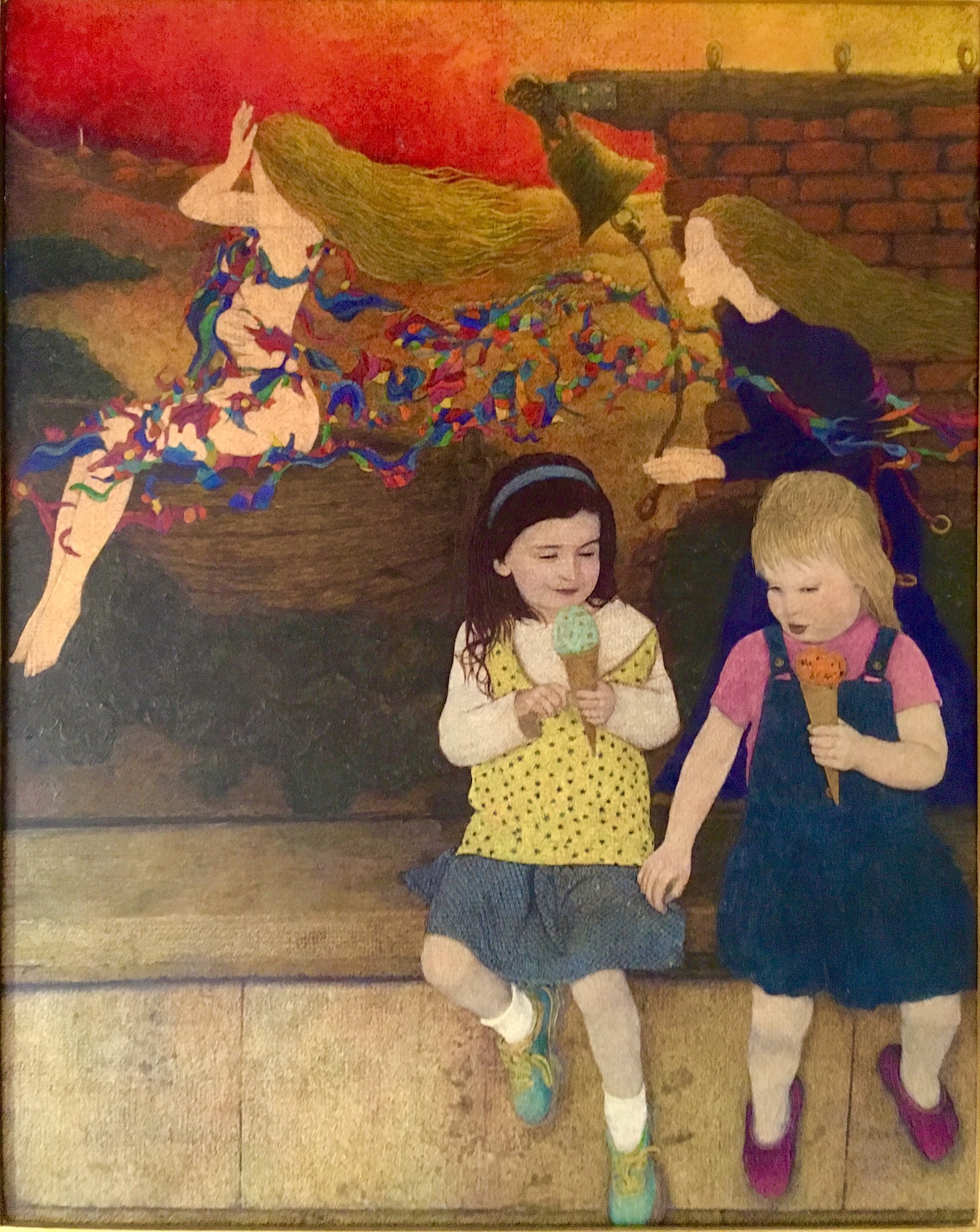"To create this piece I copied an older painting of mine – developing a smaller format in order to use its imagery as a backdrop for a new composition. The foreground imagery was done in a more realistic style" DR