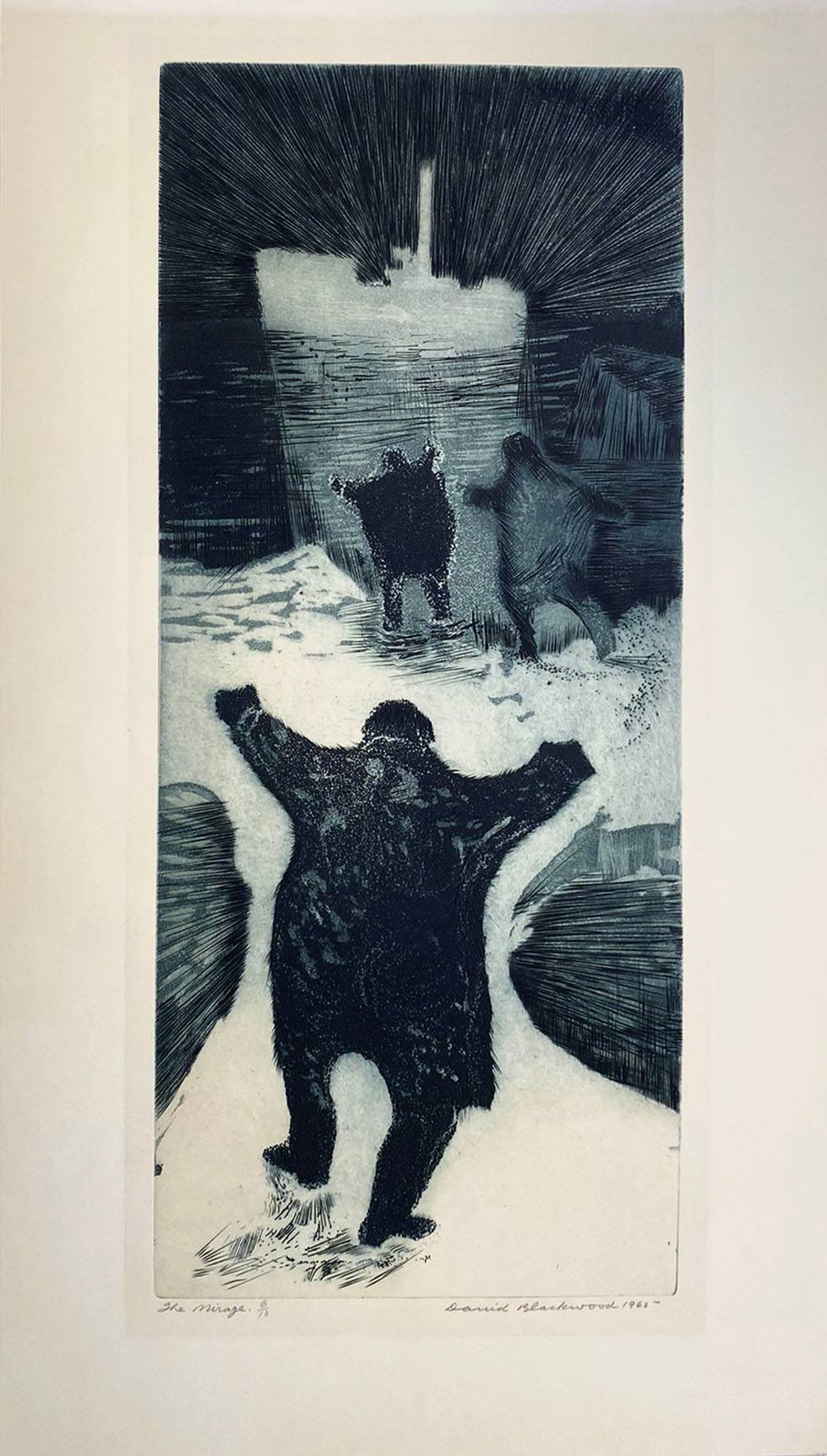 Produced during the 1960s and early 1970s, The Lost Party is a series of fifty etchings treating with the Newfoundland sealing disaster of 1914 in which a group of sealers were dropped off on the ice, but never retrieved due to confusion between the two ships' captains. More than two hundred men perished. Many of Blackwood's etchings capture the hallucinations of their final hours.