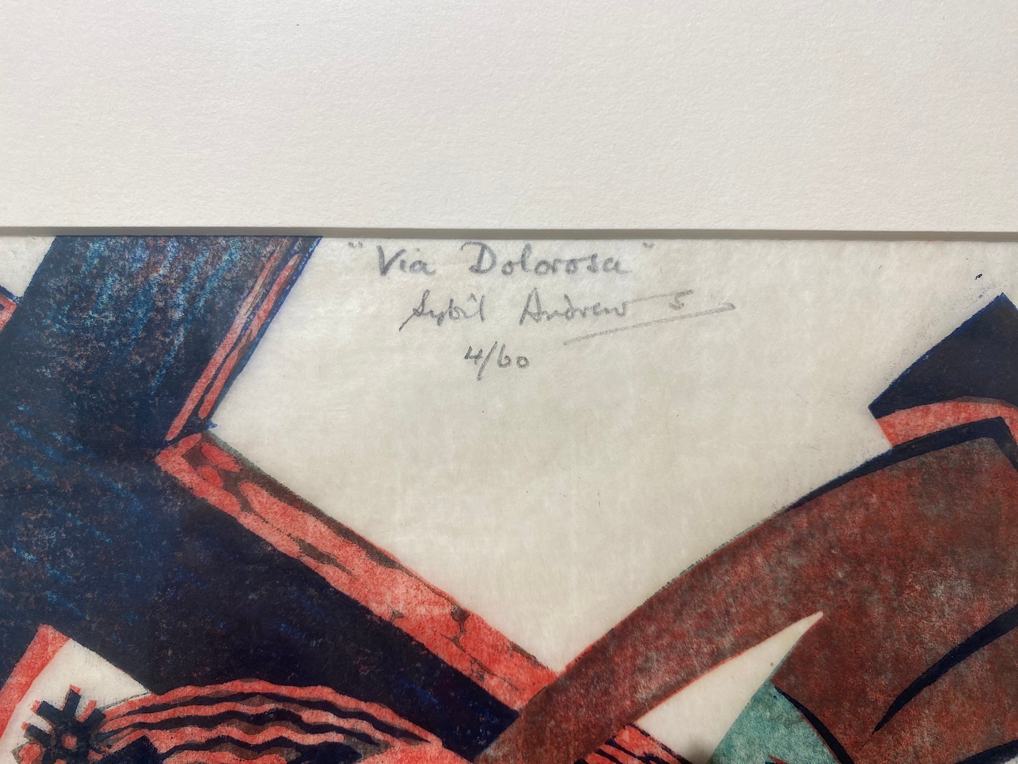 In 1925 Sybil Andrews joined the newly established Grosvenor School of Modern Art and became one of the distinct group of students associated with the tutor, Claude Flight (whom she had known since 1918). Flight pioneered the linocut technique and passed on to his pupils his interest in Cubism and Futurism. Grosvenor School works are notable for their depictions of speed and movement, modern city life, simplified forms and dynamic linear rhythms. Andrews later recalled, ‘We were the Avant-Garde in those days’.
