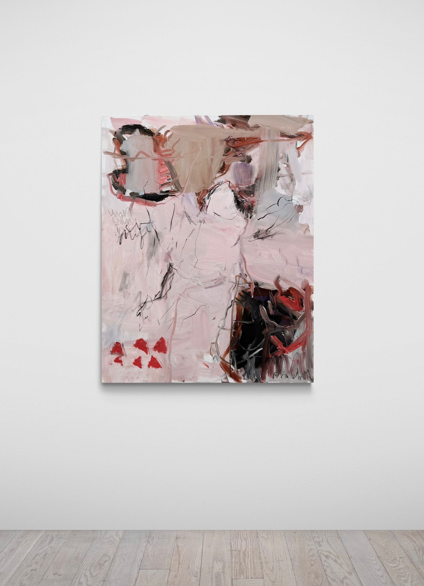 In this painting, with its soft rosé and pink hues, an angel is faintly visible. Usually, angels remain hidden, unseen by us. This artwork serves as a reminder that angels exist in our lives, often unnoticed.