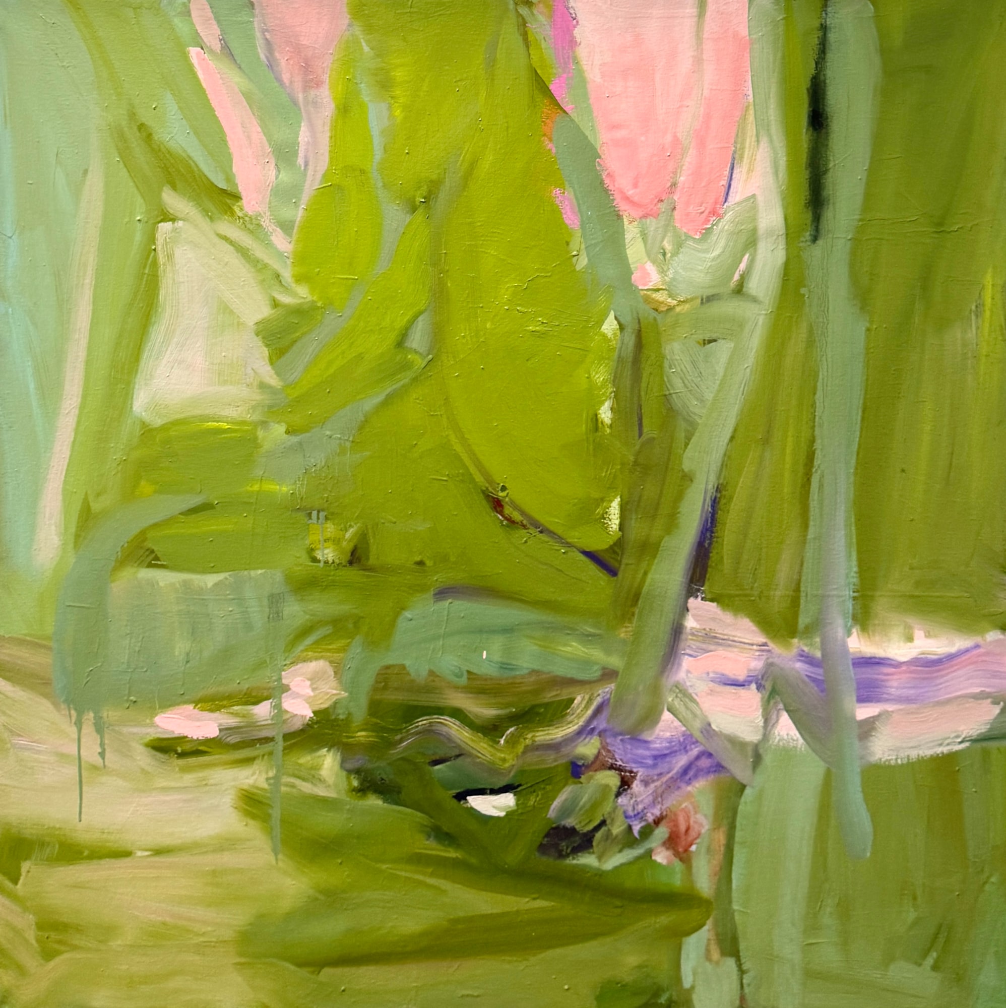 In harmony with the initial five works in this series, this painting continues the exploration of the versatile spectrum of green. Here, a robust, luminous light green takes center stage, made even stronger by rosé hues of a blossoming plant. The green expanses exude an inviting openness, rendering the composition almost monochromatic in its subtle variations. Executed with the richness of oil paints, this piece not only captures the essence of the vibrant green palette but also introduces a nuanced interplay of warmth and coolness. The result is a visually compelling and nearly monochromatic tableau that beckons viewers into a contemplative exploration of the myriad possibilities inherent in the world of green.