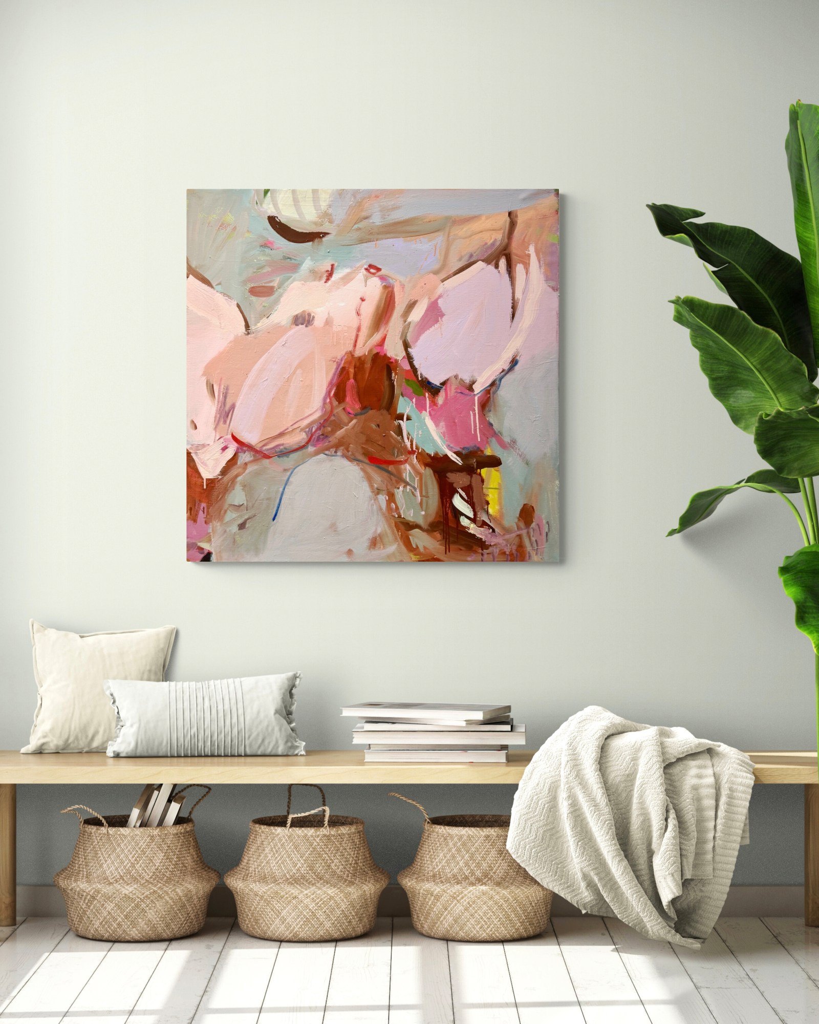 This abstract artwork, adorned in vivid red and rosé hues, exudes a vibrant and dynamic energy, akin to a spirited dance. It skillfully navigates the delicate balance between order and disorder, drawing viewers into an enthralling dance that mirrors the very essence of life itself. Executed with the richness of oil colors, the piece not only achieves a natural depth but also showcases the splendid interplay of colors, elevating the visual experience.