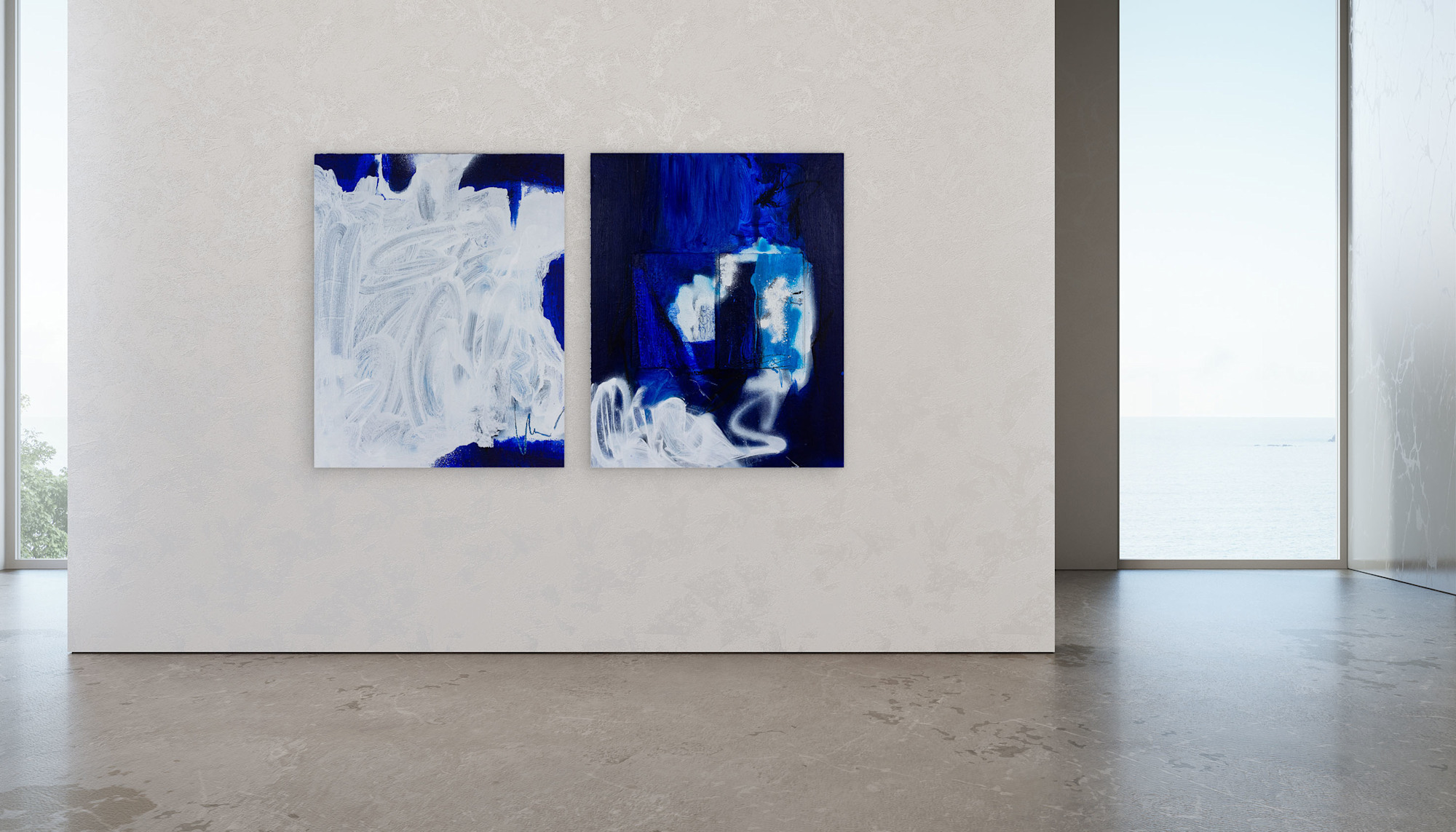 Artwork created on Canvas Wood Panel, available as complete Series Blue Cosmic Light 1-4 or as Diptych Nr. 1+2 ;