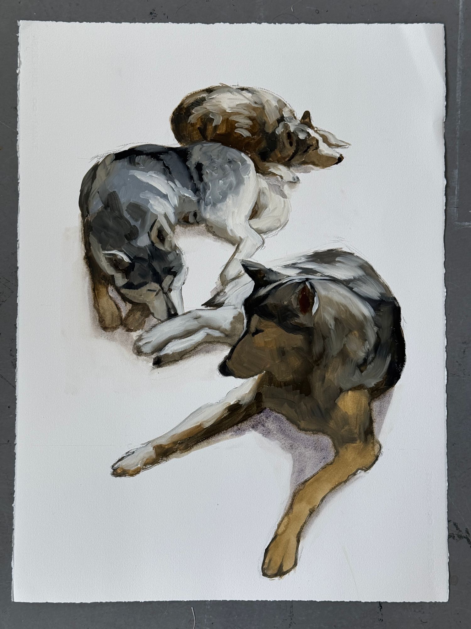 During my stay I immersed myself in the local scene, especially through a collaboration with goHusky, the dog sledding company run by María and Gunnar. Surrounded by twenty-nine huskies playing, sleeping, and working, I sketched from life in pen and ink, capturing their energy (mostly asleep) and individual personalities. Back in the guest studio of the Akureyri Art Museum, I developed these quick studies into quick oil sketches on paper.