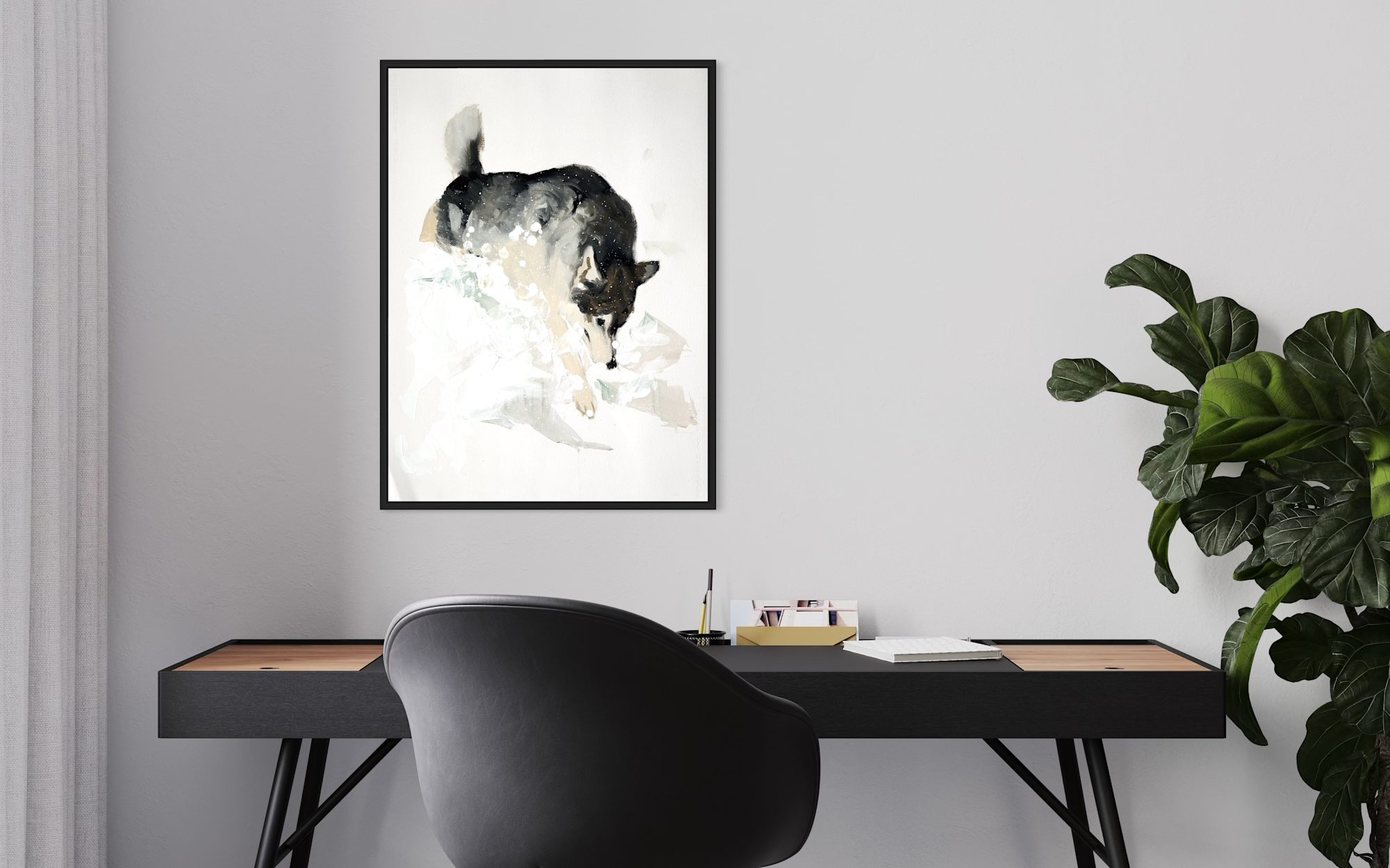 During my stay I immersed myself in the local scene, especially through a collaboration with goHusky, the dog sledding company run by María and Gunnar. Surrounded by twenty-nine huskies playing, sleeping, and working, I sketched from life in pen and ink, capturing their energy (mostly asleep) and individual personalities. Back in the guest studio of the Akureyri Art Museum, I developed these quick studies into quick oil sketches on paper.