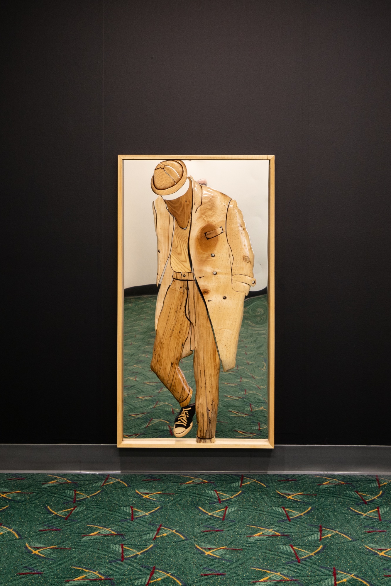 ‘Welcome In’ features a human figure in motion leaving the confines of the space and stepping out of the box onto the iconic Portland airport carpet.