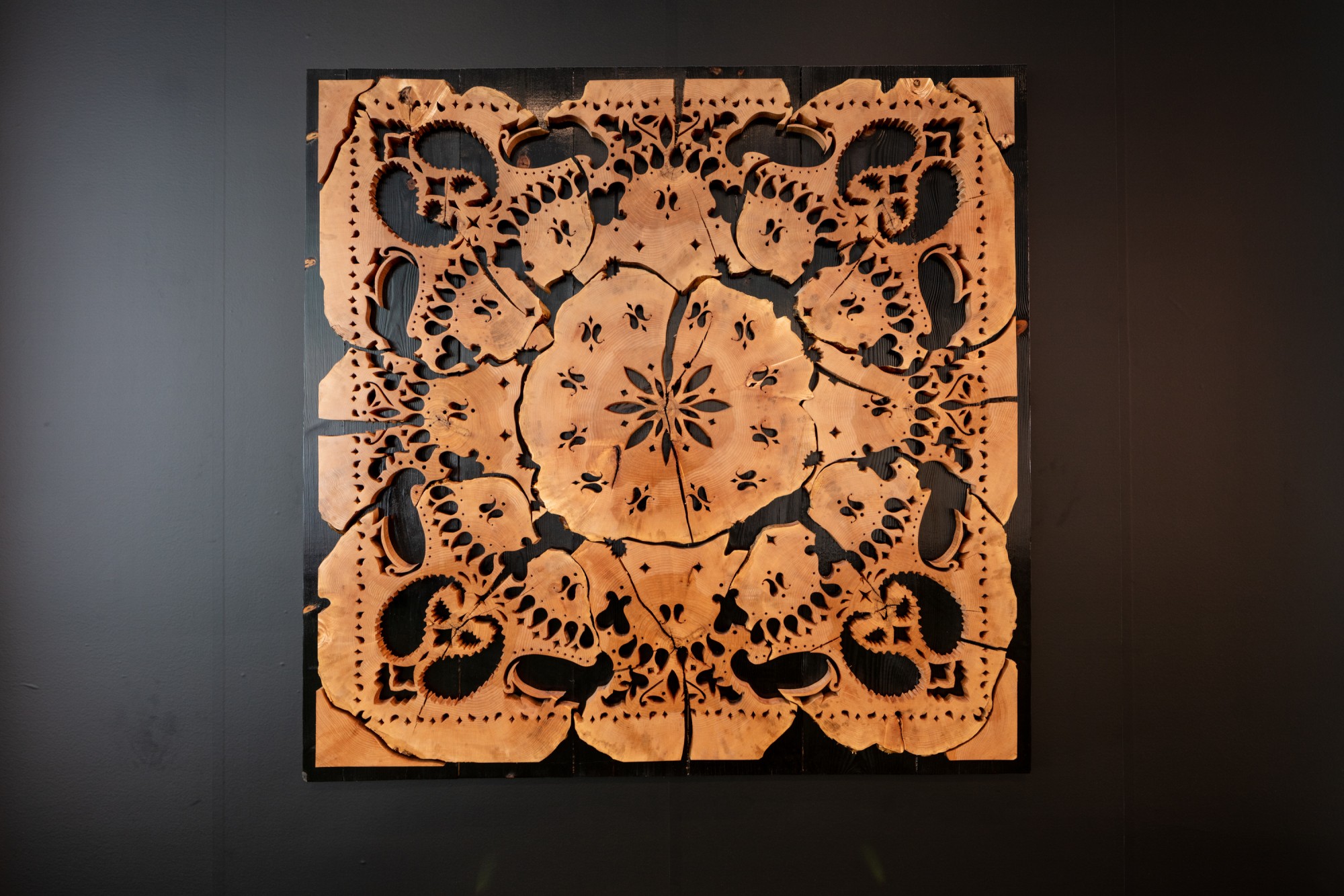 ‘Welcome Home’ was conceptualized after a conversation with a middle aged man who was born and raised in Portland. He spoke about growing up in the 70, 80, 90s and his need to feel like he belonged and included in the lifestyle of the streets of those times. Though associated with negative connotations, the Bloods gang offered the man a home and family. ‘Welcome Home’ utilizes 9 “cookies” from the same spruce tree and incorporates the imagery of the paisley handkerchief worn by the Bloods members.