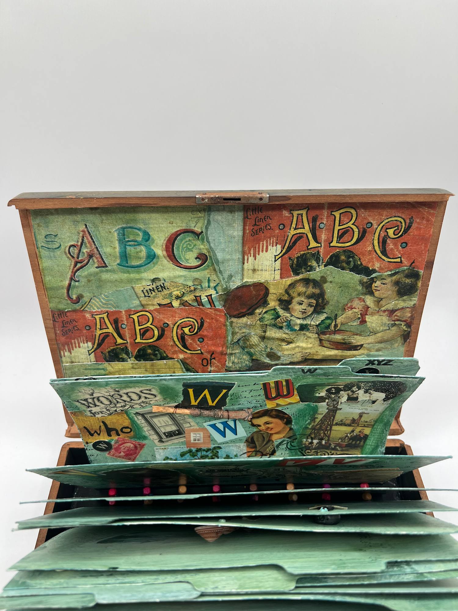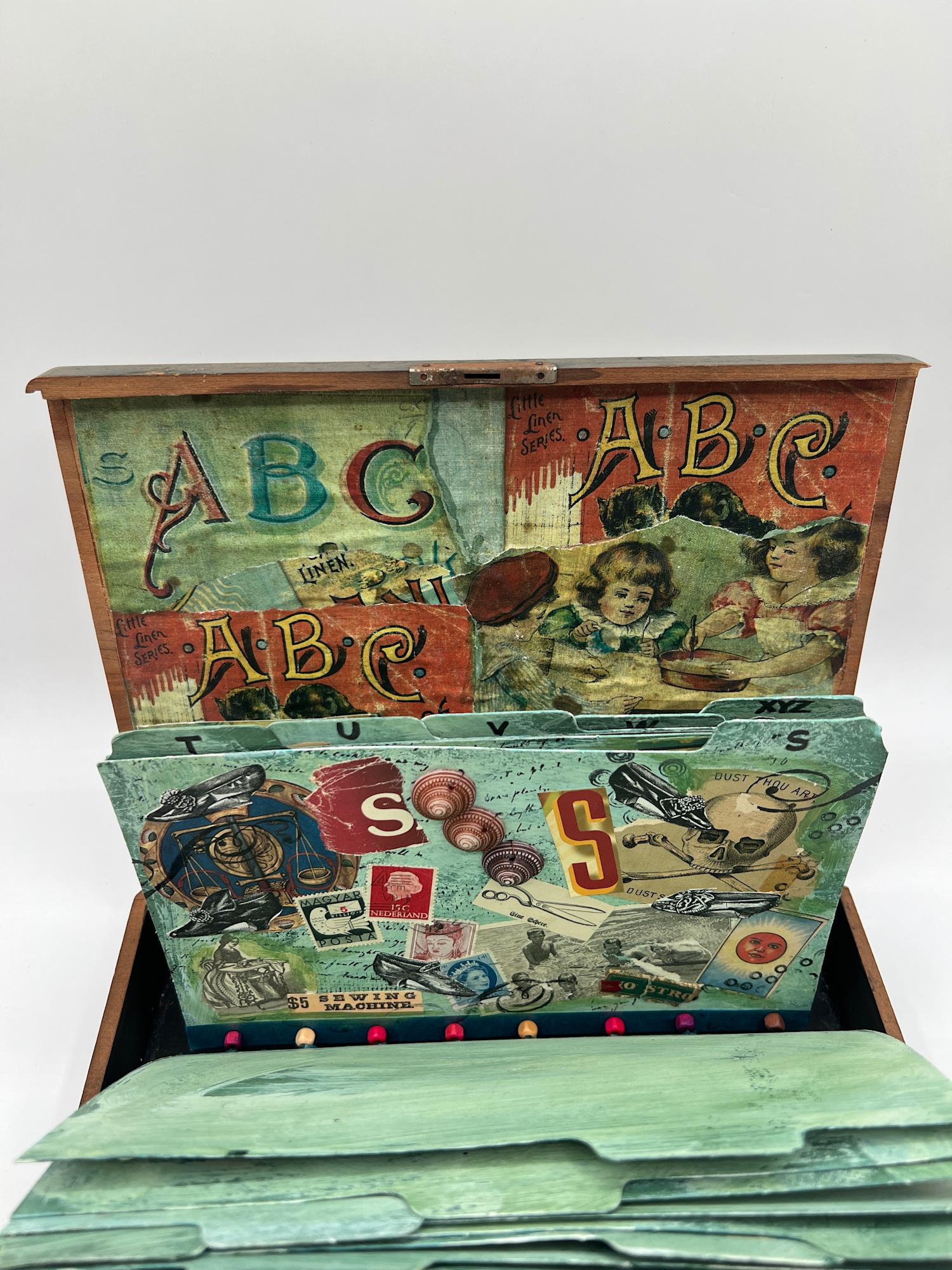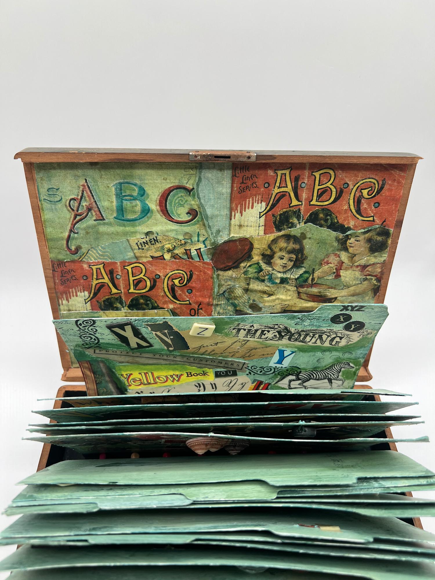26 file cards have been altered with a variety of images related to the alphabet. They are housed in a flat box and hinged in a way that resembles an actual file drawer