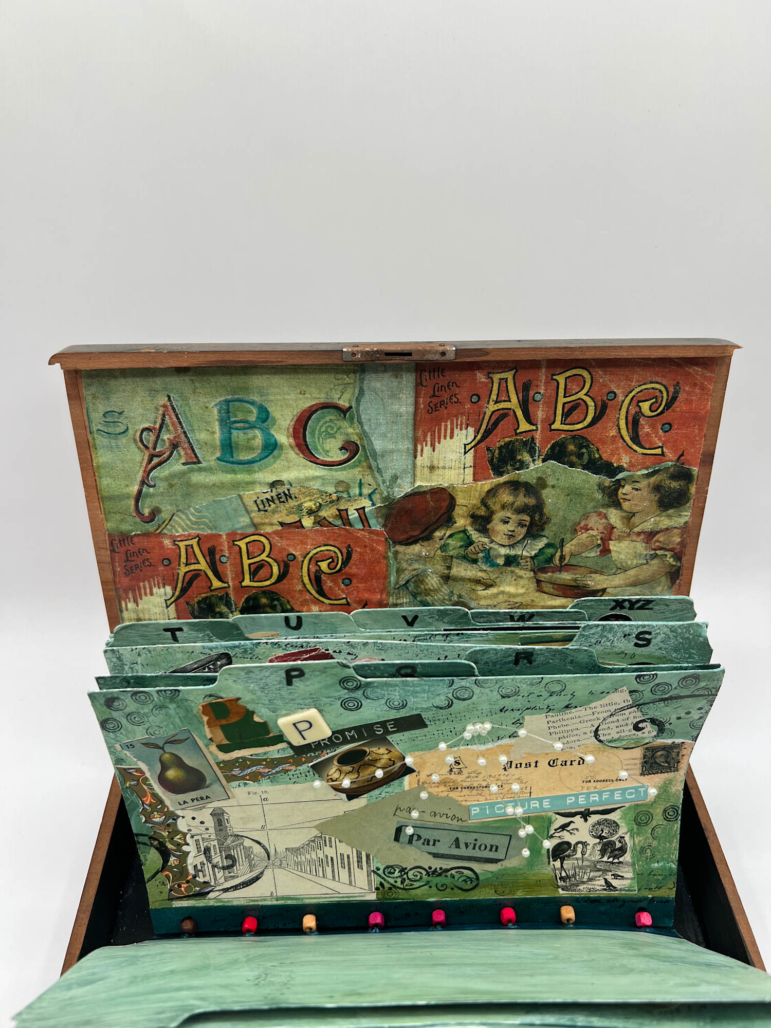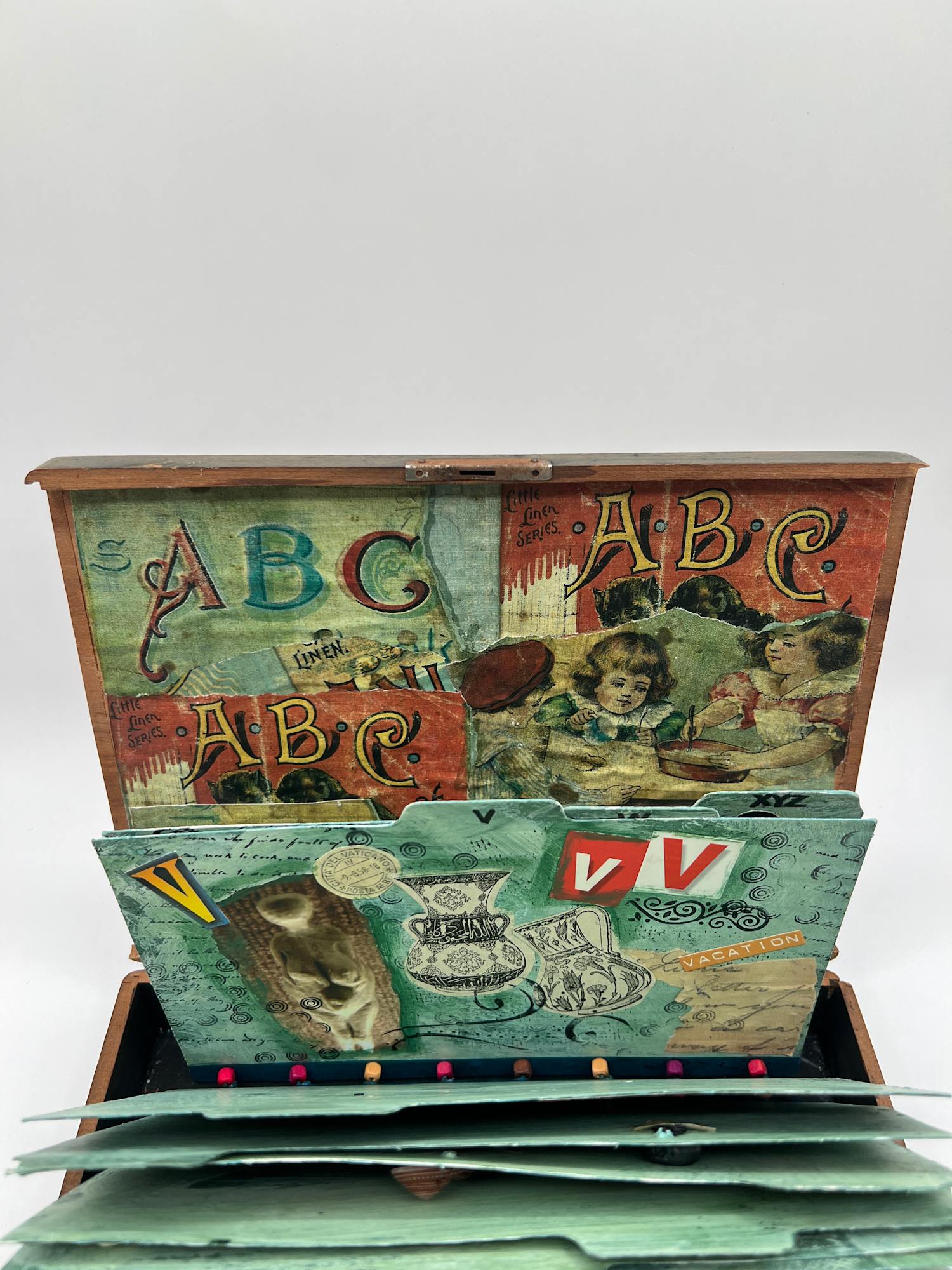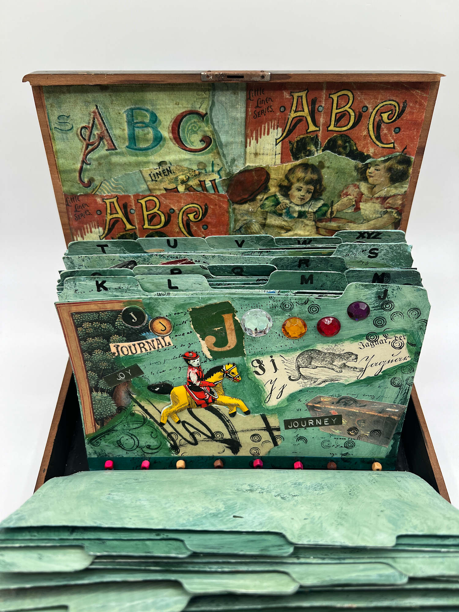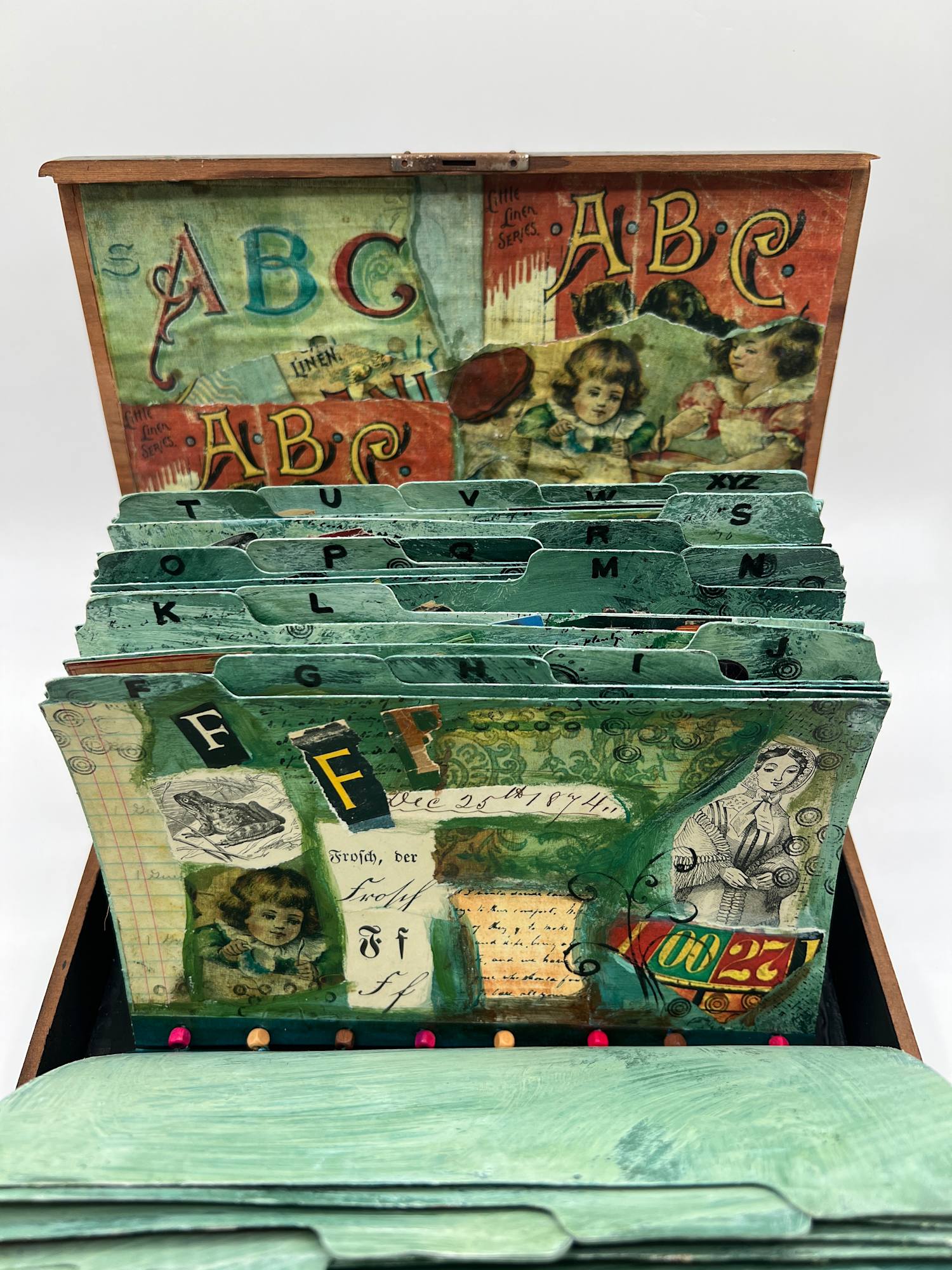 26 file cards have been altered with a variety of images related to the alphabet. They are housed in a flat box and hinged in a way that resembles an actual file drawer