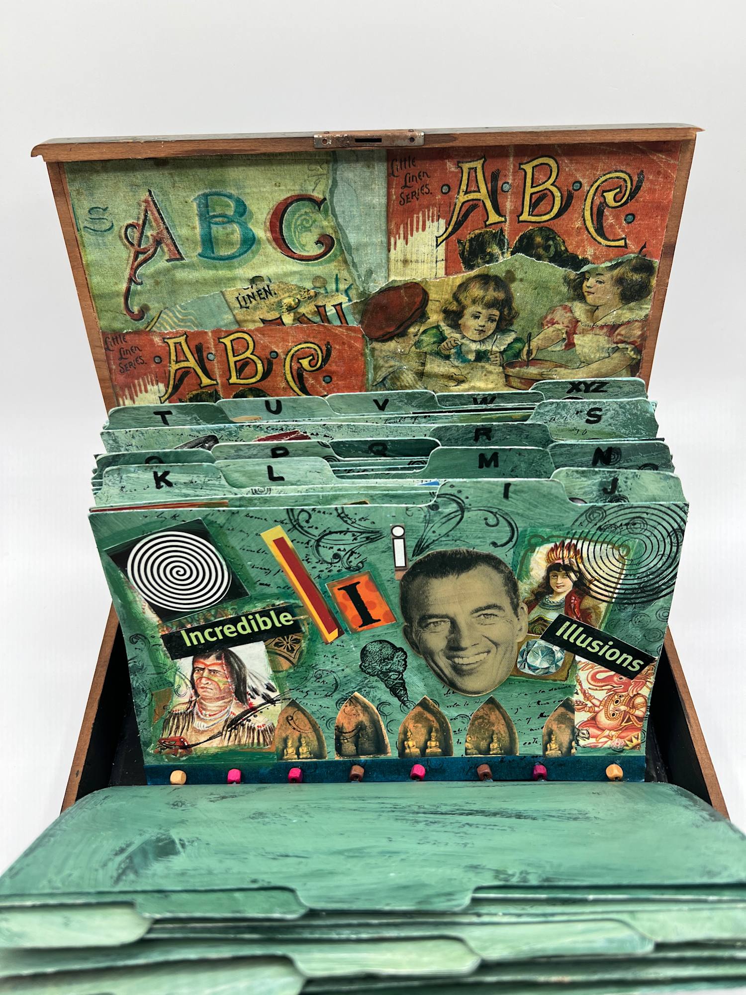 - Subject Matter: File box style format holds 26 collage illustrted cards, one for each letter of the alphabet