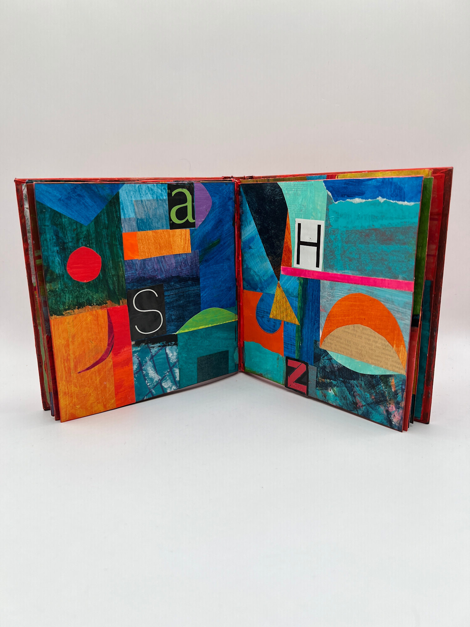 Hand painted paper collage with scattered alphabet in altered book