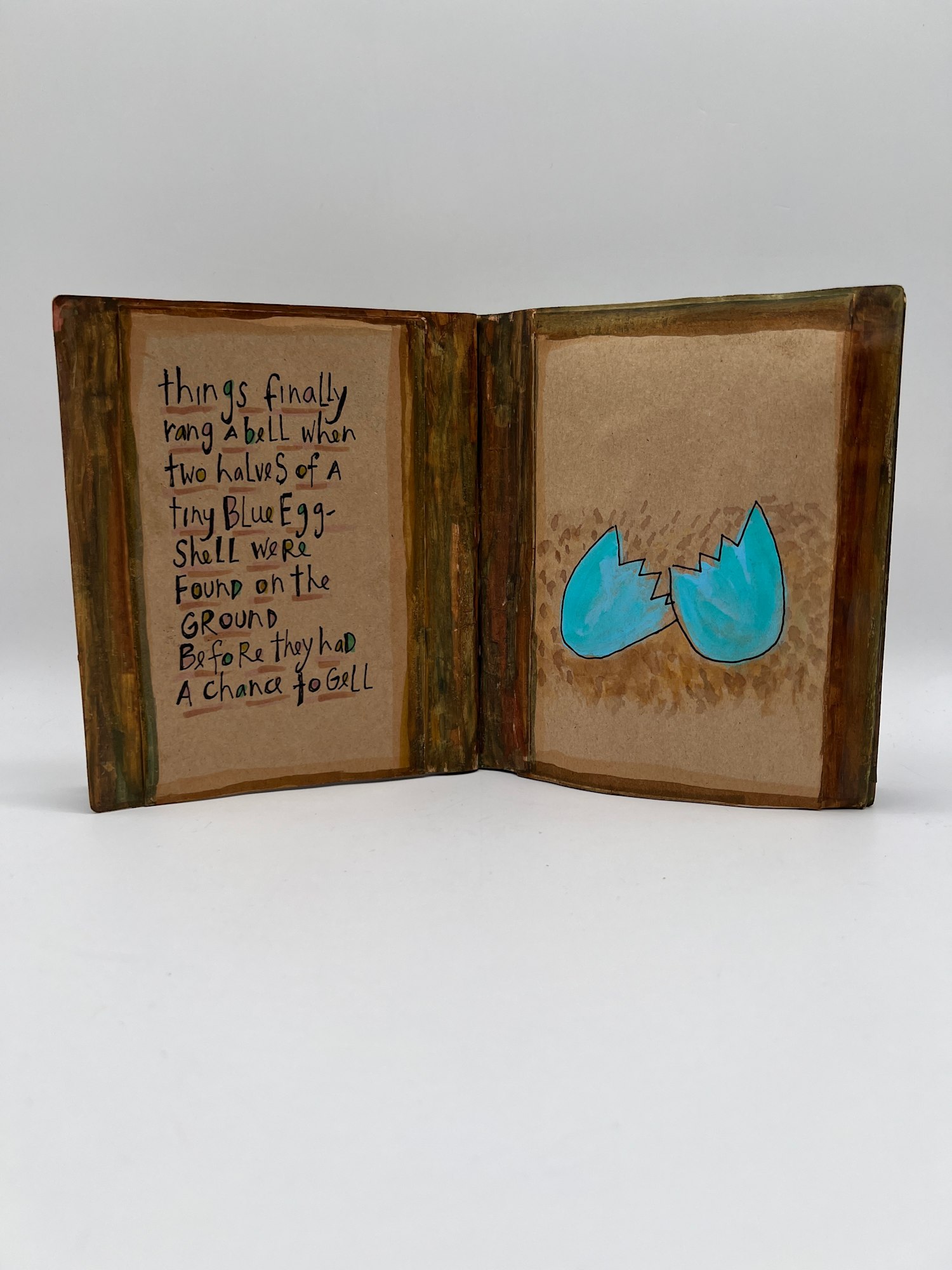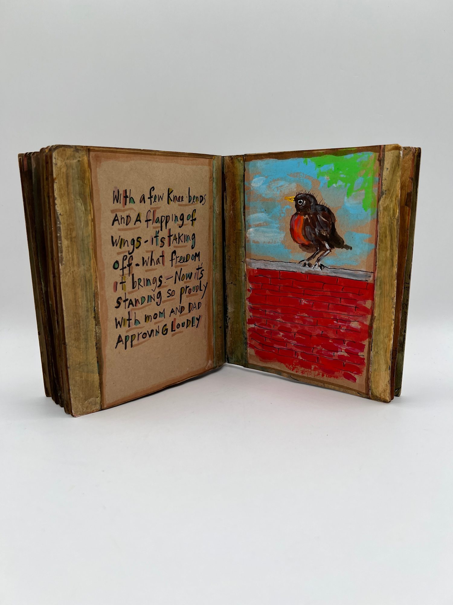 Watercolor, ink and gauche illustration of a true story about the birth and first flight of a robin. Includes plexiglass case with the actual bird's nest.