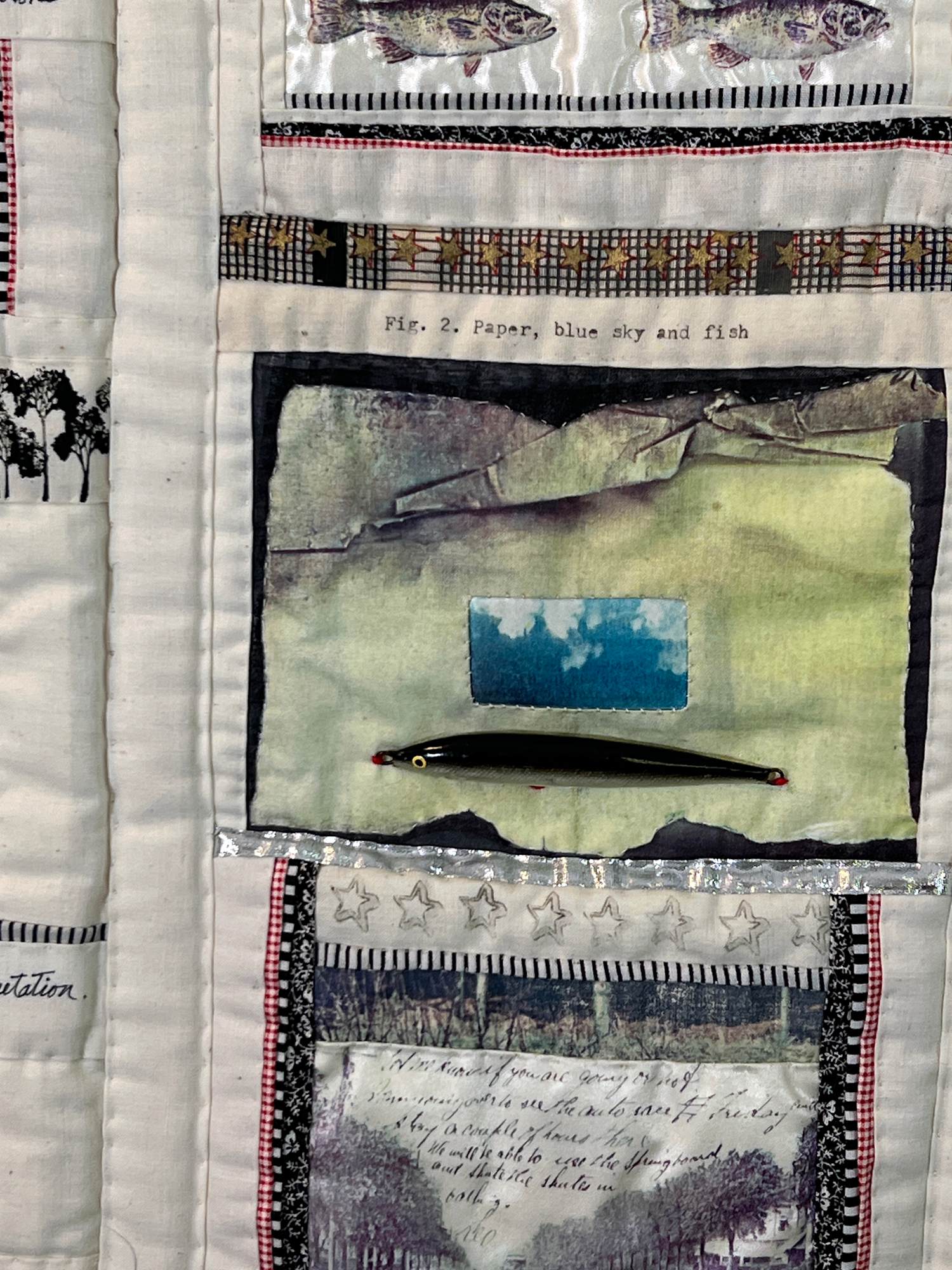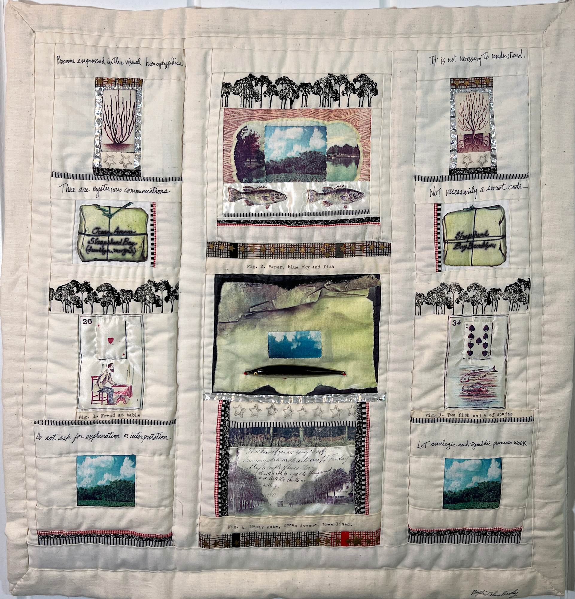 - Subject Matter: Hand quilted wall piece with transfers, objects and text text