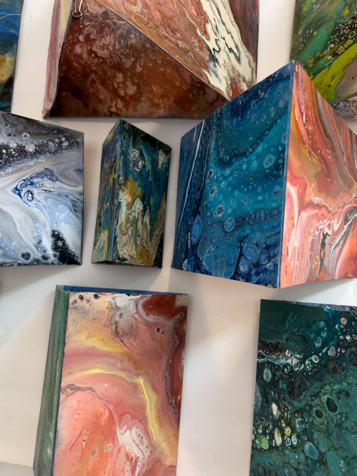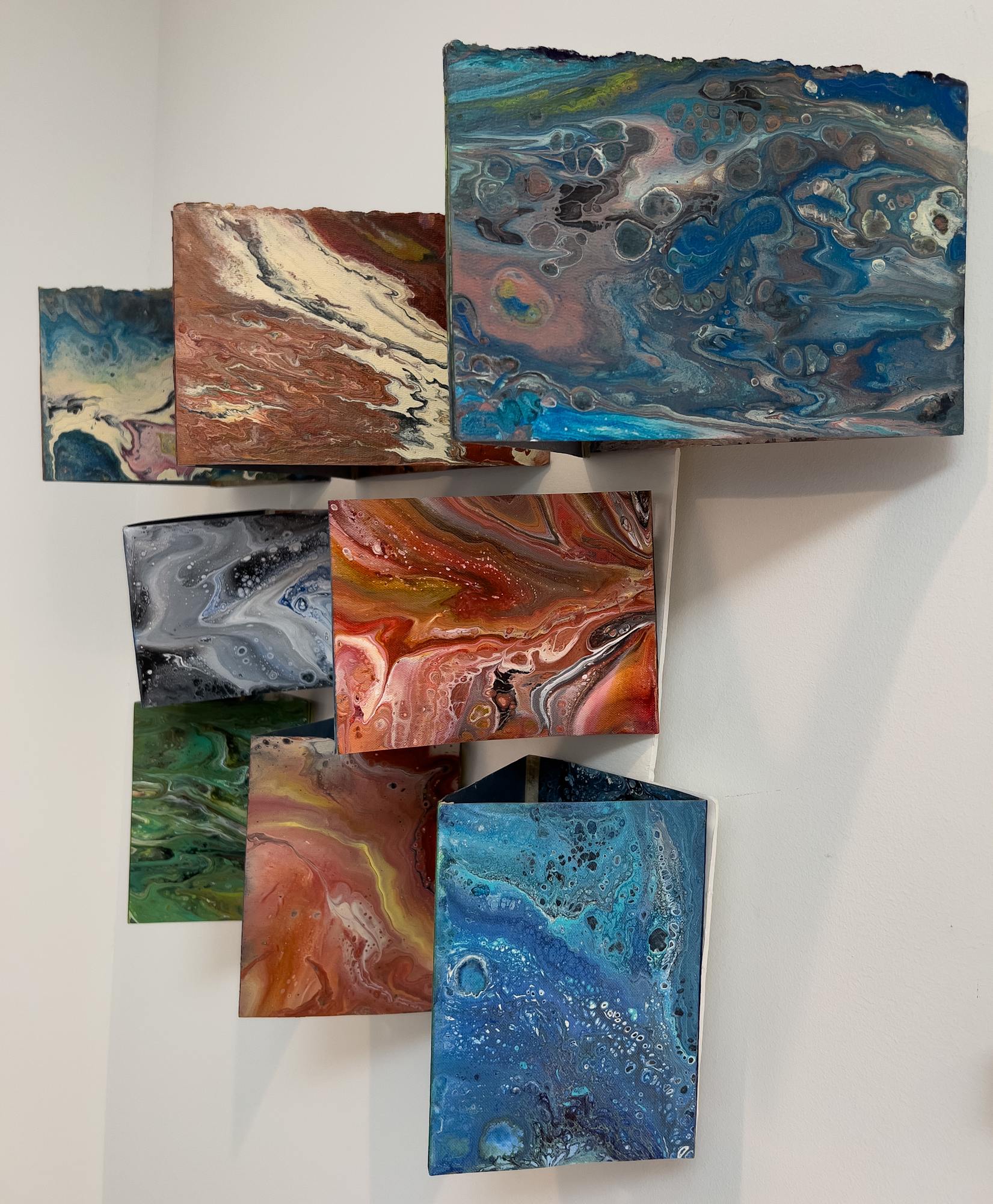 Acrylic paint was layered and poured on cotton boards then assembled into triangular forms which are mounted on foam core