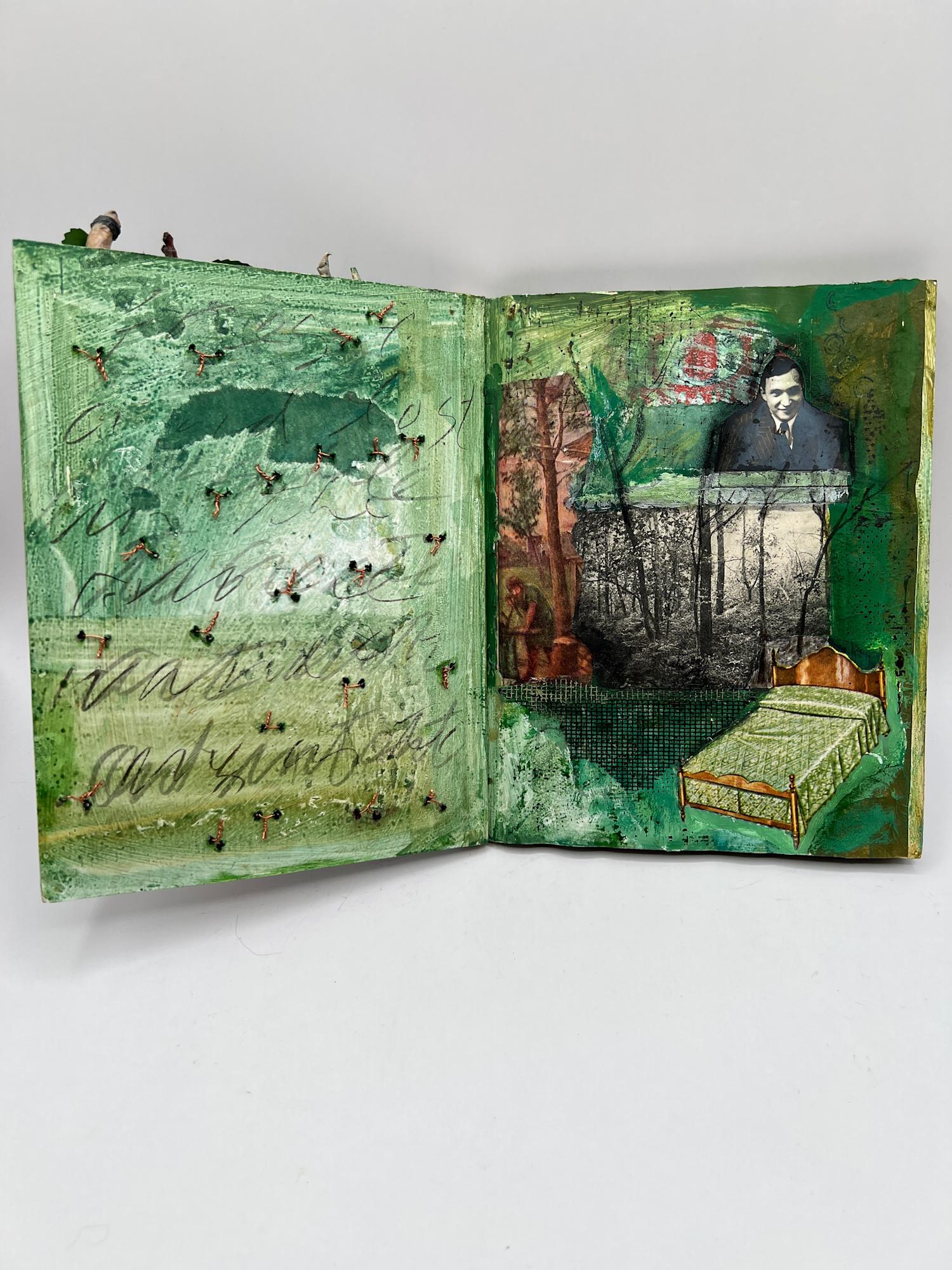 14 page altered artist book of mixed media and collage images in a forest setting with a dreamlike, fairy-tale scenario.