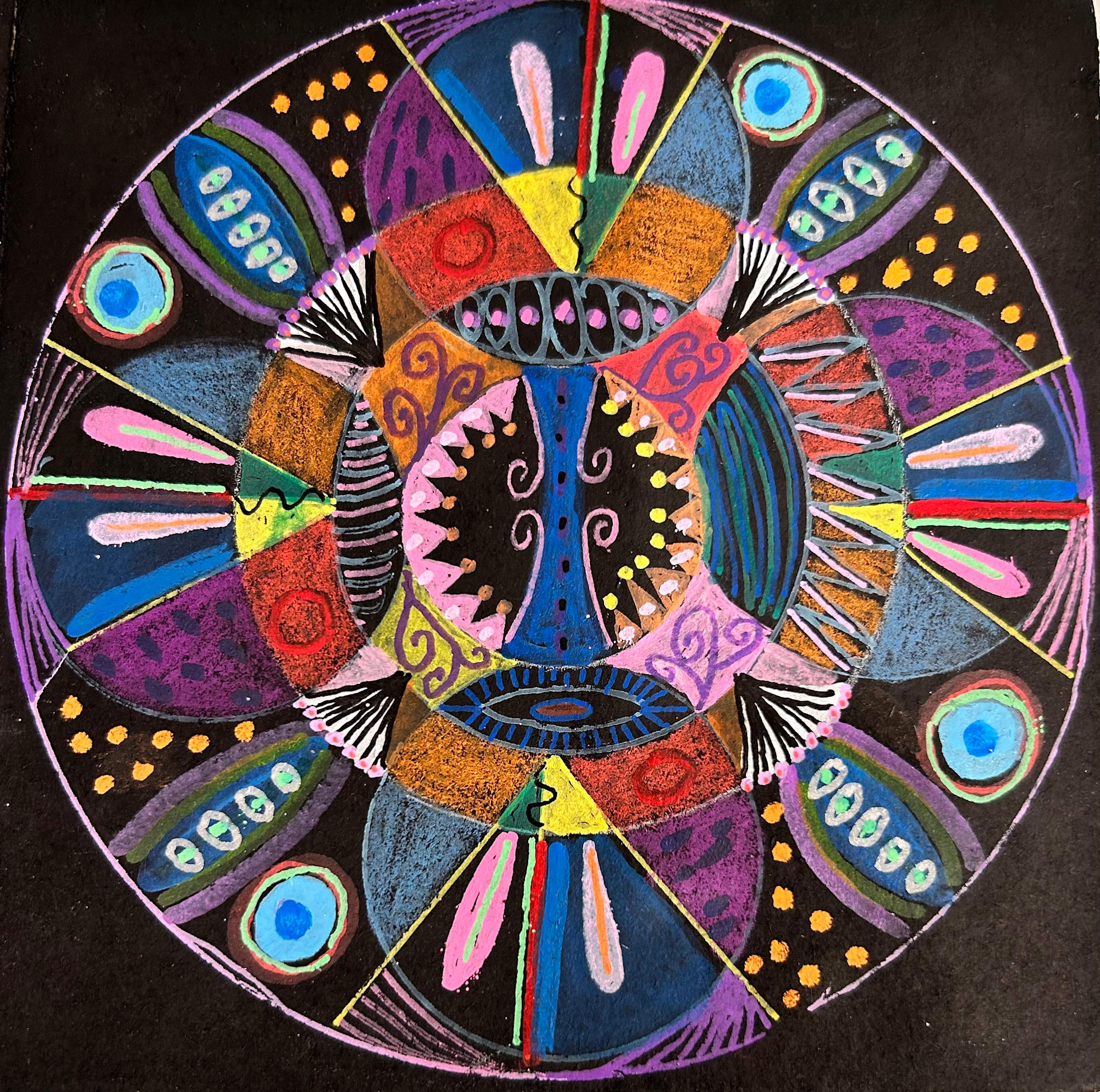 Altered 12 page board book with intricate geometric circular designs and patterns using stencils, ruler, and compass and detailing paint markers.