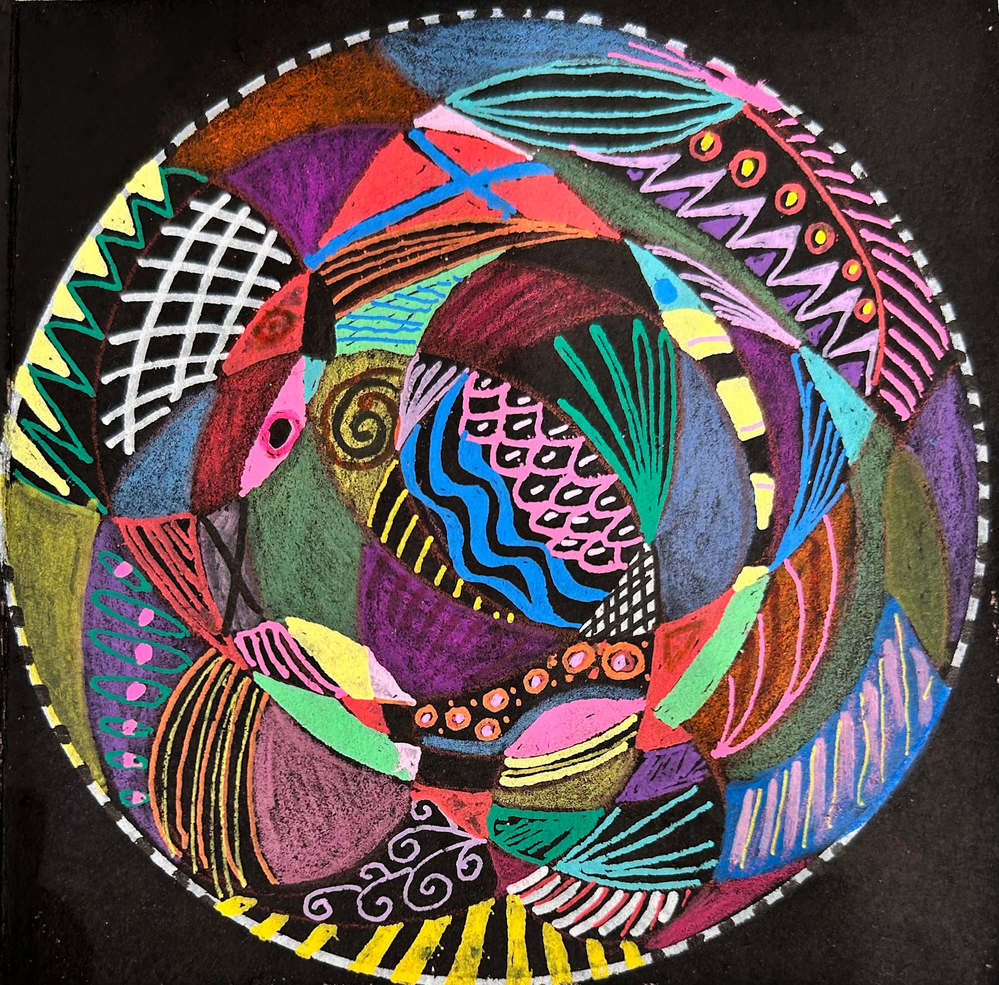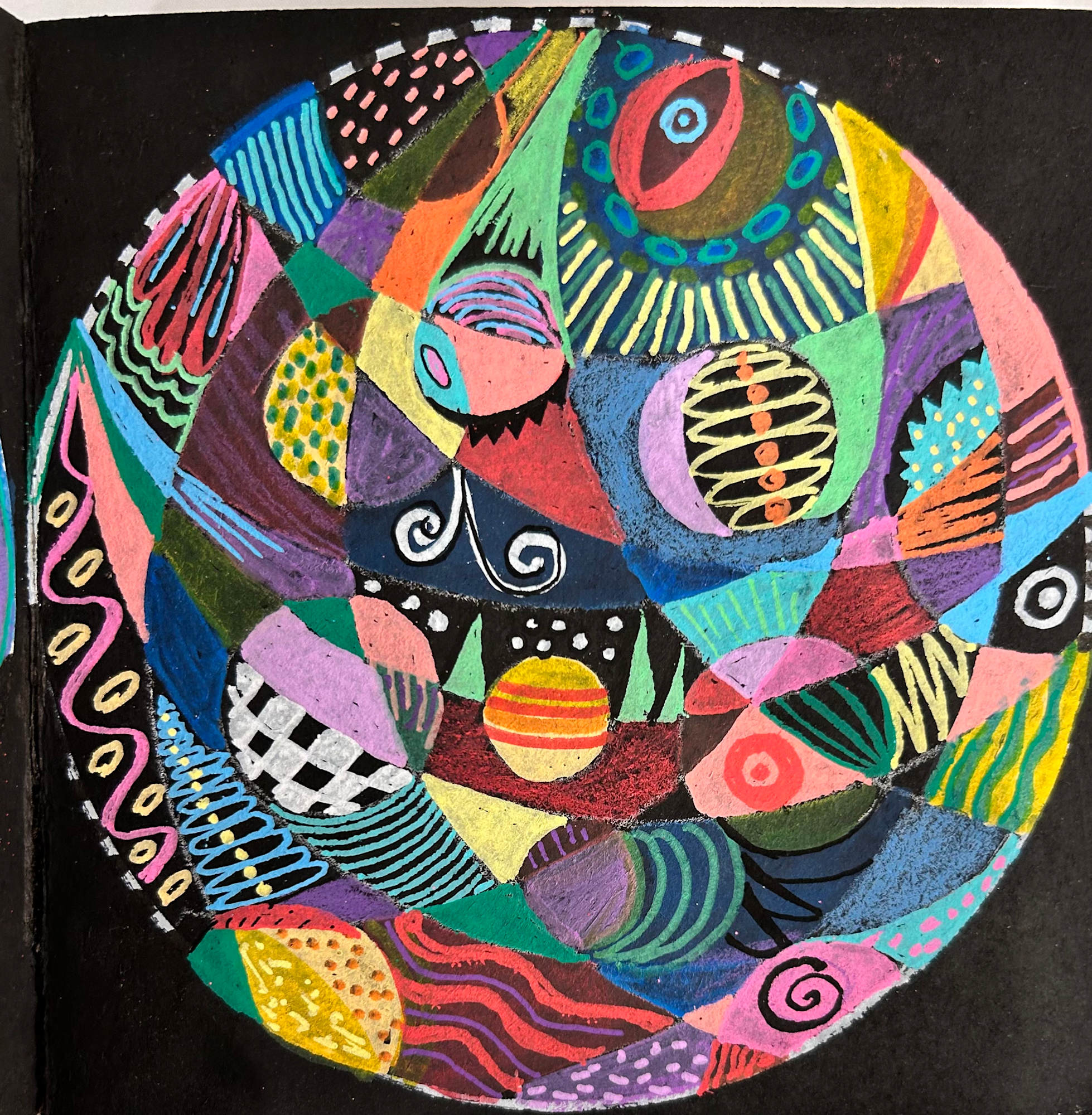 - Subject Matter: Altered book of colorful abstract geometric circular designs